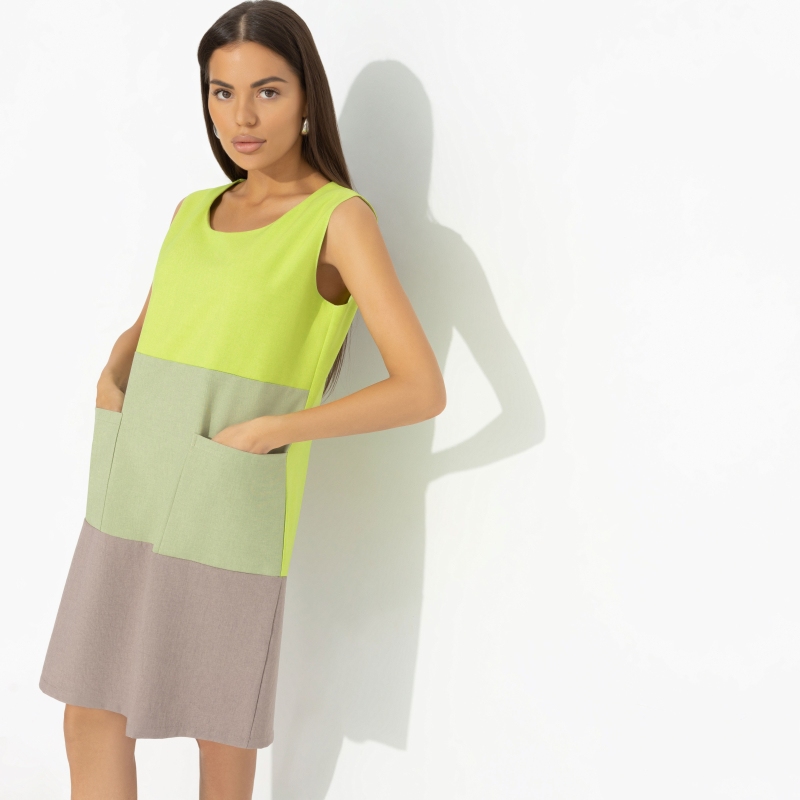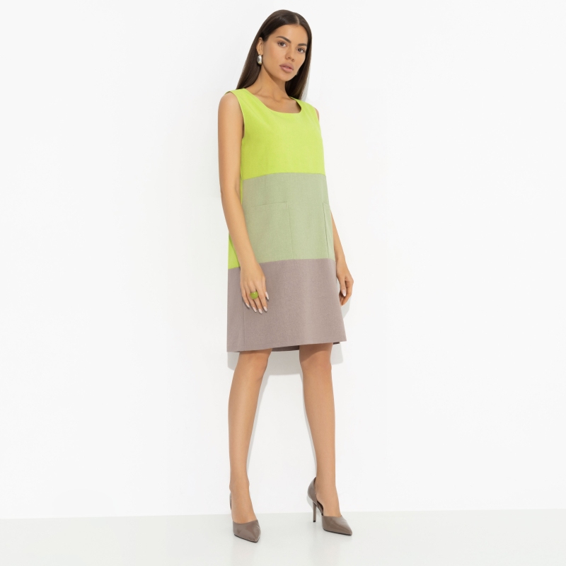 Чтобы влиться в новую компанию, важно расположить всех к себе. Легче сделать это в платье CHARUTTI. Оттенки зеленого и бежевого психологи называют самыми комфортными для образа. Мы интуитивно доверяем людям, одетым в эти цвета. А это вам и нужно. Платье без рукавов прямого силуэта длиной до колена. Комбинация трех видов материала. Есть объемные карманы по передней стороне изделия.