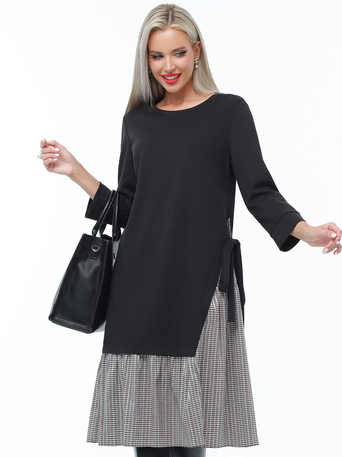 Необычная модель платья, похожая на тунику с драпированной расклешенной юбкой. Верх с рукавами длины семь восьмых сделан асимметрично - на левом боку высокий разрез до талии, который можно регулировать широкими завязками. Волан подшит так, что создает убедительную имитацию отдельной юбки. Платье в повседневном стиле прекрасно сочетается с туфлями, сапогами или кроссовками - на ваш выбор.