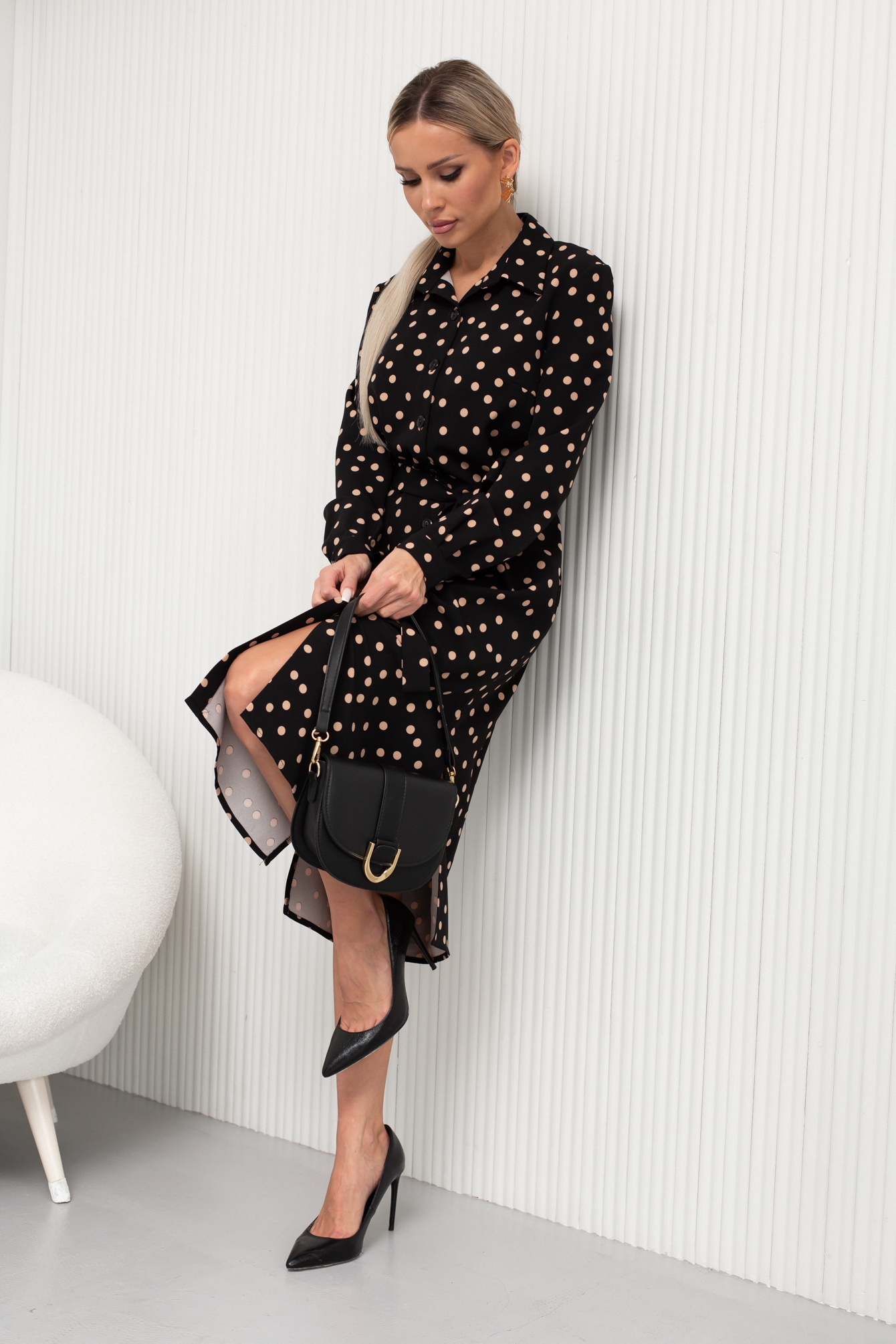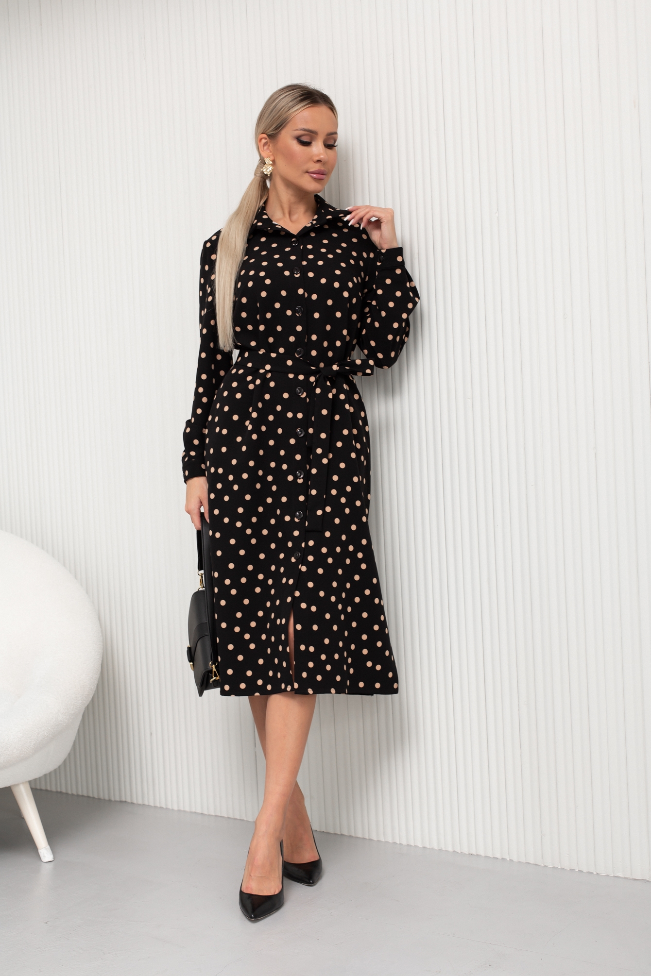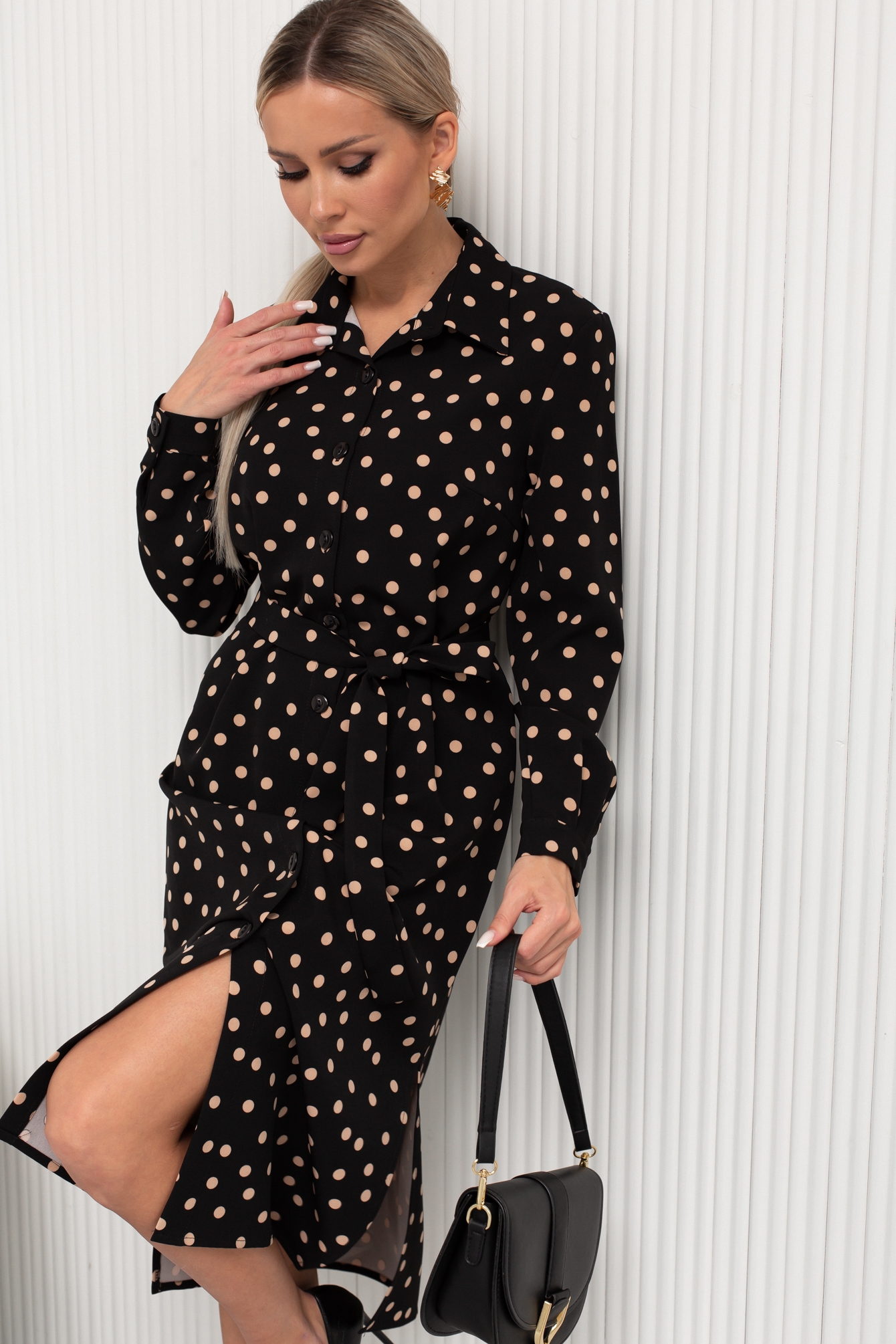 Элегантное платье - рубашка с принтом горох. Классический рубашечный отложной воротник и планка до низа на пуговицах. Платье прямого силуэта, пояс дополнительно акцентирует талию. Втачные длинные рукава оканчиваются манжетами. Низ ровный, по бокам разрезы. Универсальный вариант для работы и для отдыха. Тканевый пояс входит в комплект.