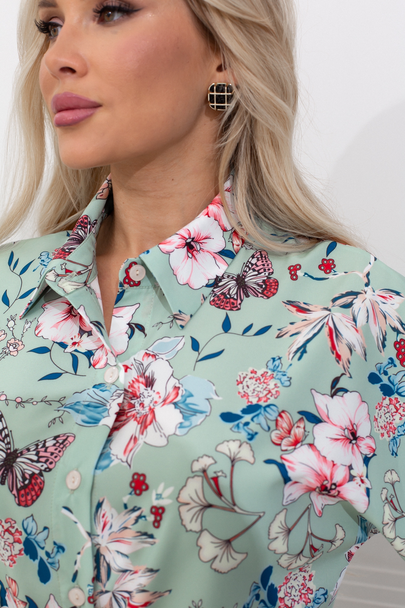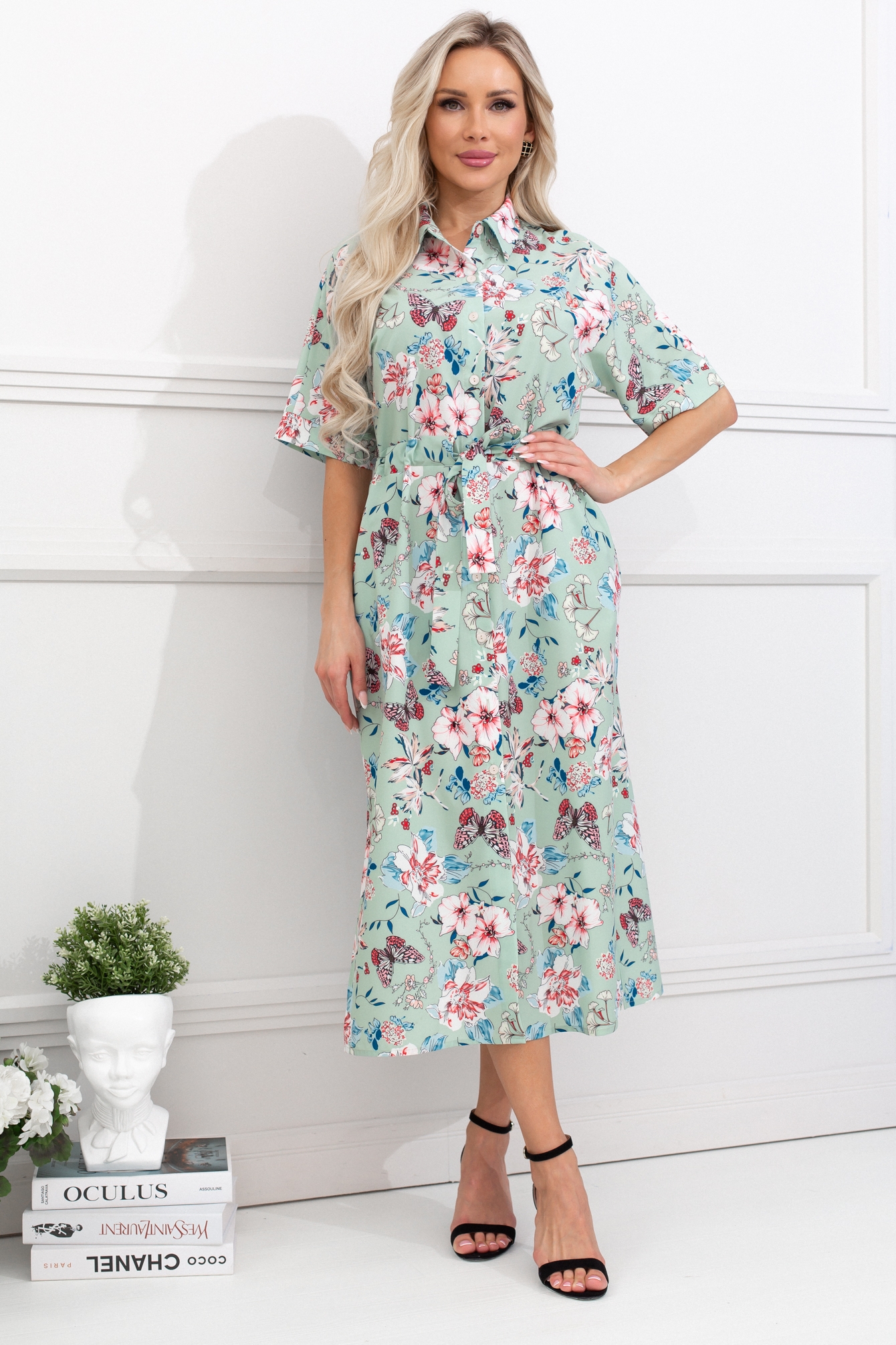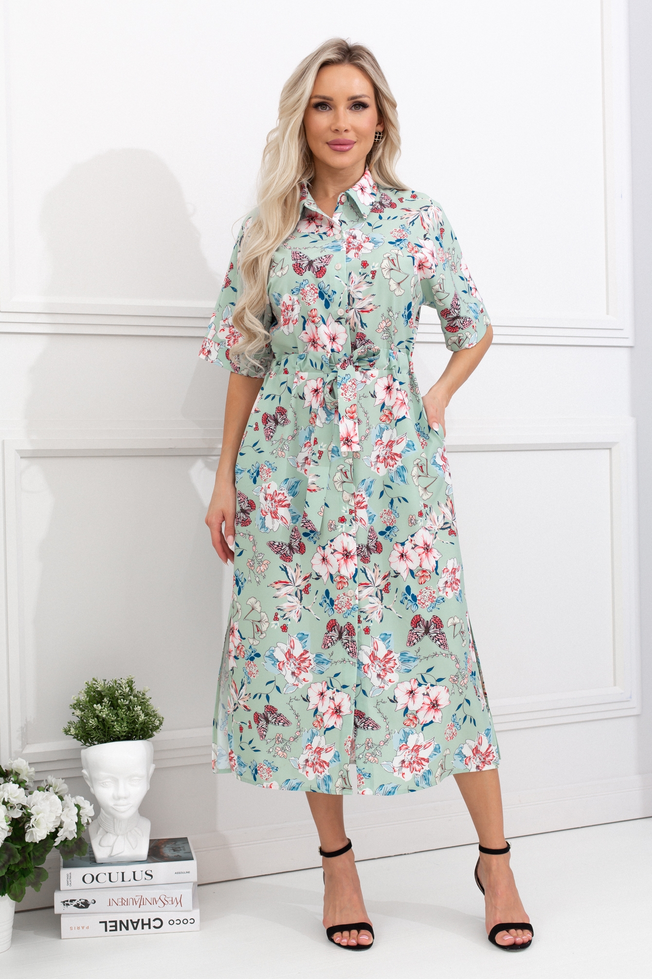 Легкое платье приталенного силуэта. Короткий цельнокроенный рукав с притачной манжетой. Горловина оформлена отложным воротником на стойке переходящим в планку с застежкой на петли и пуговицы. Модель отрезная по линии талии, дополнена кулиской. В боковых швах функциональные карманы. Низ ровный, по бокам разрезы.