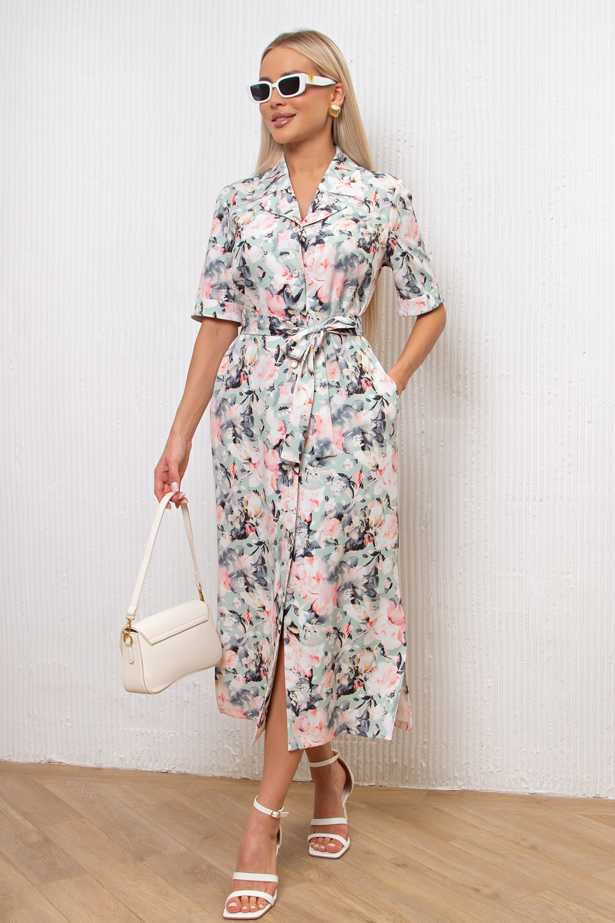 Комфортное платье-рубашка прямого кроя из плательной ткани. V-образная горловина оформлена отложным воротником, по переду застежка на петли и пуговицы. Короткий втачной рукав с отложной манжетой. В боковых швах функциональные карманы. Низ ровный, по бокам разрезы. Пояс из основной ткани в комплекте.