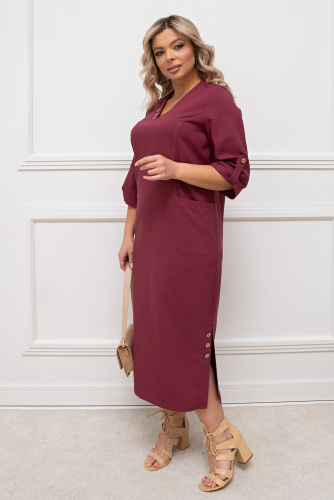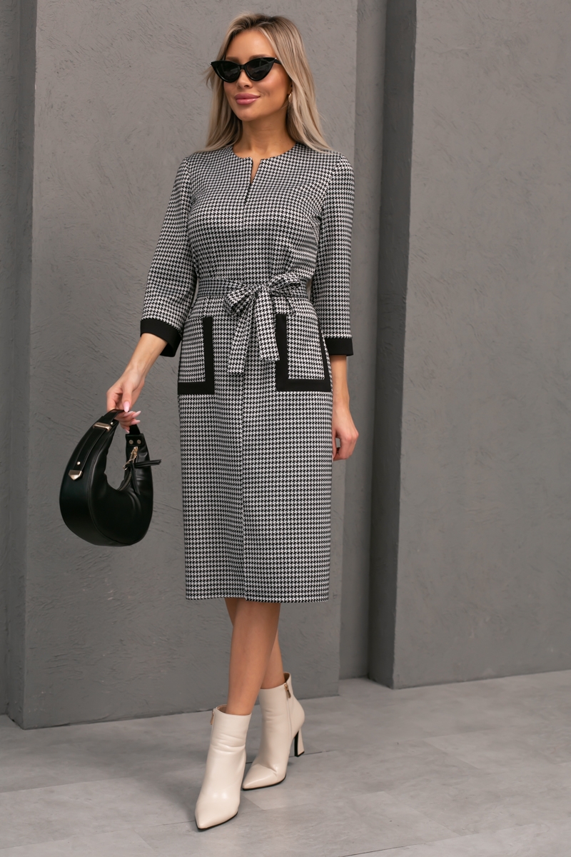 Стильное платье прямого силуэта из трикотажного полотна. Округлая горловина на внутренней обтачке. Зона декольте дополнена потайной молнией. Втачной рукав 3/4 оканчивается притачной манжетой. По переду накладные карманы. Низ ровный, по переду разрез. Пояс из основного материала входит в комплект.