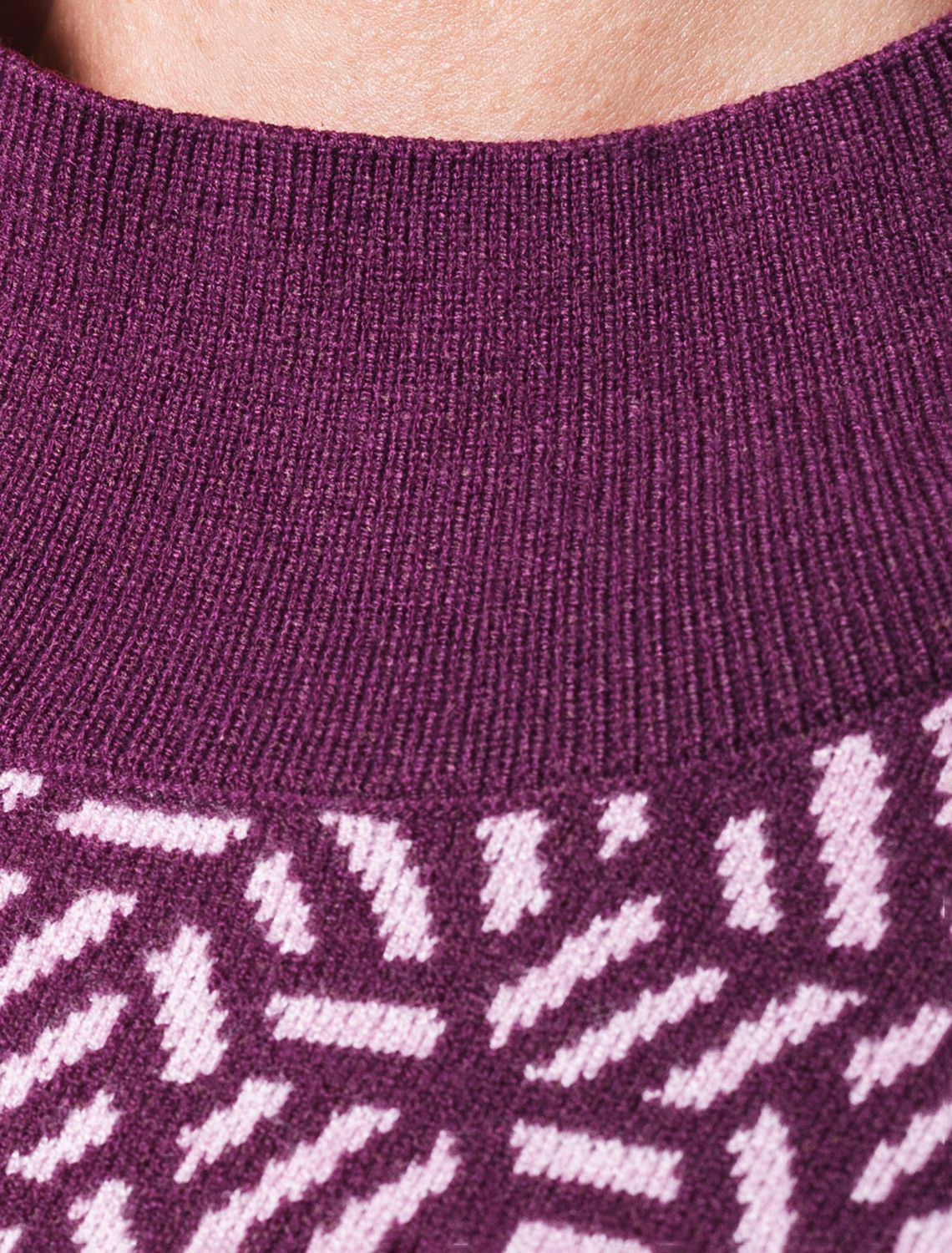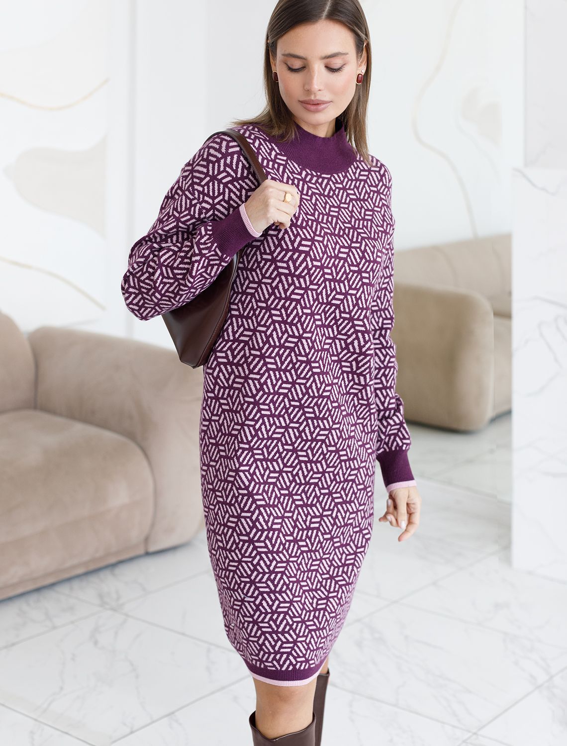 Платье жаккардовой вязки выполнено из мягкой пряжи на основе вискозы с добавлением кашемира. Модель свободного силуэта с высоким воротом и длинным рукавом. Нежная пряжа очень комфортно ощущается на теле, сохраняя оптимальное тепло при этом не перегревая. Совет стилиста: жаккардовое платье отличная инвестиция в базовый гардероб, которая поможет создать дорогие образы. Носите с высокими сапогами удлиняя силуэт или плотными колготками. 50%Вис 20%ПА 20%ПЭ 10%Кашемир