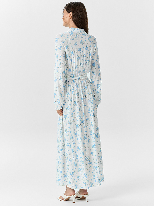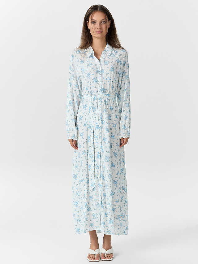 Женское платье-рубашка с цветочным принтом — это воплощение легкости и женственности в элегантном повседневном образе. Миди-длина придает модели утонченность, делая ее подходящей как для прогулок, так и для неформальных встреч. Застежка на пуговицы по всей длине обеспечивает удобство и позволяет регулировать степень открытости — от классического до более расслабленного варианта. Отложной воротник добавляет структурности, а длинные рукава с деликатной сборкой подчеркивают романтический характер образа. Тканый пояс акцентирует талию и придает силуэту легкую выразительность. Вискозная ткань дарит коже мягкость и комфорт, красиво струится и подчеркивает женственные линии. Такое платье можно дополнить сандалиями, балетками или даже кедами — и каждый раз оно будет звучать по-новому.