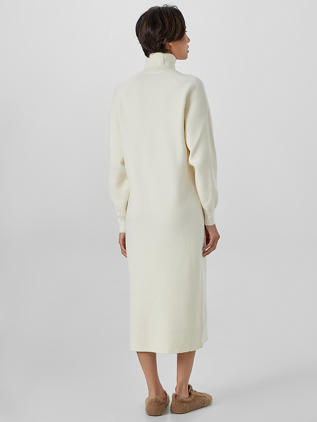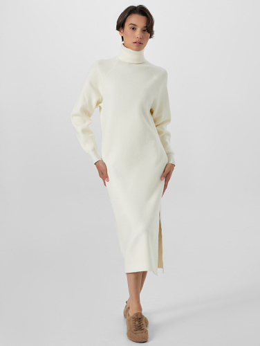Женское бежевое платье с длинными рукавами — элегантная модель для прохладного сезона. Высокий воротник-стойка не только эффектно обрамляет шею, но и надежно защищает от холода. Длина ниже колен и рукава, зауженные на манжетах, создают утонченный, вытянутый силуэт. Стильный вырез на левом бедре — вносит в образ ноту современности.