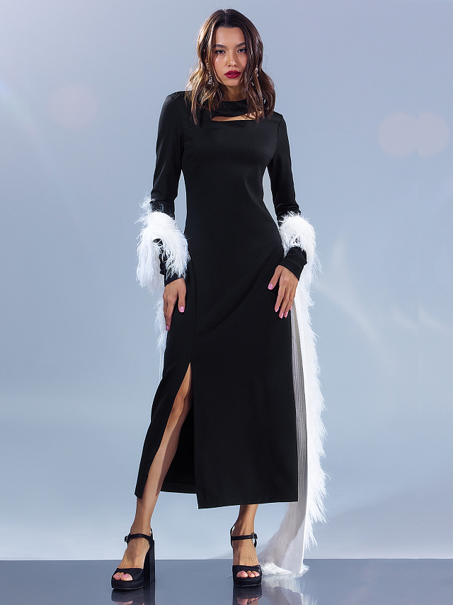 Эффектное женское платье облегающего силуэта. Фигурный вырез спереди и потайная застежка-молния на спинке добавляют элегантности, а удлиненные рукава, слегка расширяющиеся к низу, придают модели стильный акцент. Это платье идеально подходит для создания роскошных образов на любые торжественные мероприятия. Дополните его аксессуарами и изящной обувью на каблуке, чтобы завершить праздничный look. Позвольте себе сиять в этом платье и создайте незабываемые моменты на праздничных вечерах!