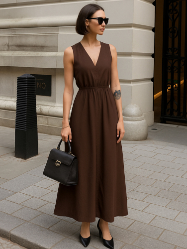 Женское платье макси А-силуэта — это элегантная и воздушная модель, идеально подходящая для теплого времени года. Углубленная V-образная горловина подчеркивает линию декольте, придавая образу женственность и легкость. Горловина и проймы аккуратно окантованы бейкой из основного полотна, что обеспечивает чистую отделку и сохраняет форму изделия. Перед и спинка выполнены со средним швом, что визуально вытягивает силуэт и подчеркивает вертикаль. В боковых швах предусмотрены удобные карманы, которые добавляют практичности, не нарушая лаконичности дизайна. Нижний срез обработан швом вподгибку, что придает изделию аккуратный и завершенный вид. Платье выполнено из сочетания лиоцелла и рами — натуральных волокон, известных своей прочностью, воздухопроницаемостью и приятной текстурой. Такая ткань мягко струится по телу, не перегревает и дарит ощущение комфорта даже в жаркую погоду. Это платье станет отличным выбором для прогулок, отдыха или летних мероприятий, сочетая в себе стиль, удобство и натуральную эстетику.