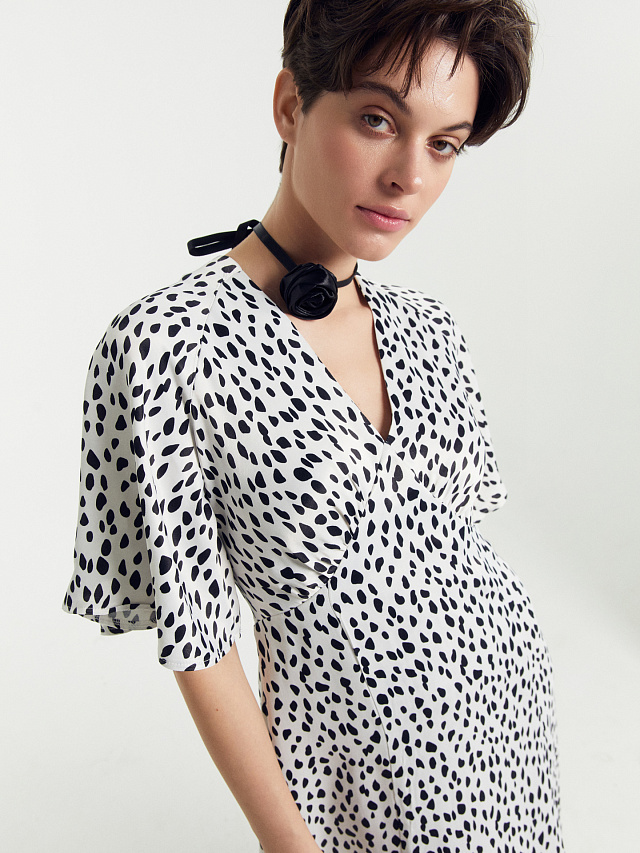 Эффектное платье женское полуприлегающего силуэта из ткани. В составе изделия 100% вискозы. Материал красиво струится по фигуре, создавая женственный образ. Горловина V-образной формы, обработана обтачкой. Рукав реглан, расширяется к низу, длина чуть выше локтя. Лиф с подрезом под грудью и сборкой. Спинка с застежкой на потайную молнию. Низ платья с рельефами по переду и спинке, расширяется к низу. Длина - миди. Стильное и очень красивое — отличный выбор для вечера, свидания и любого торжества. Также, его можно использовать в качестве повседневного на каждый день в офис на работу. Важно: мы рекомендуем проявлять осторожность в эксплуатации изделия при использовании аксессуаров (часов, подвесок и т.д.), а также сумок и галантереи в связи с особенностями производства полотна!