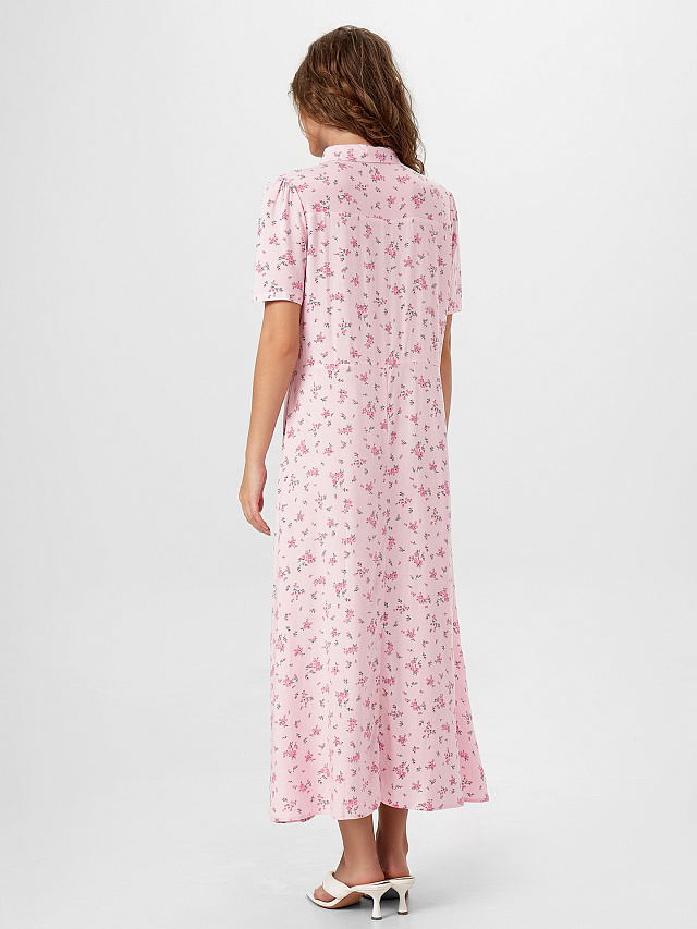 Женское миди-платье — воплощение элегантности и утонченного стиля, созданное для тех, кто ценит изящные силуэты и комфорт. Приталенный крой подчеркивает фигуру, создавая женственный образ, а расклешенная книзу юбка добавляет легкость и динамику в движения. Классический отложной воротник придает нотку строгости, делая модель универсальной как для будней, так и для особых случаев. Короткие рукава уравновешивают силуэт, добавляя легкости и идеально подходя для теплого времени года. Застежка на пуговицах не только удобна, но и служит стильным акцентом, дополняя общий образ. Изделие выполнено из вискозы — мягкого, дышащего материала, который приятно ощущается на теле и обеспечивает комфорт в течение всего дня. Это платье идеально подходит для прогулок, офисных будней, встреч с друзьями и романтических вечеров. Стильно, женственно и практично — базовая вещь, которая станет украшением любого гардероба.