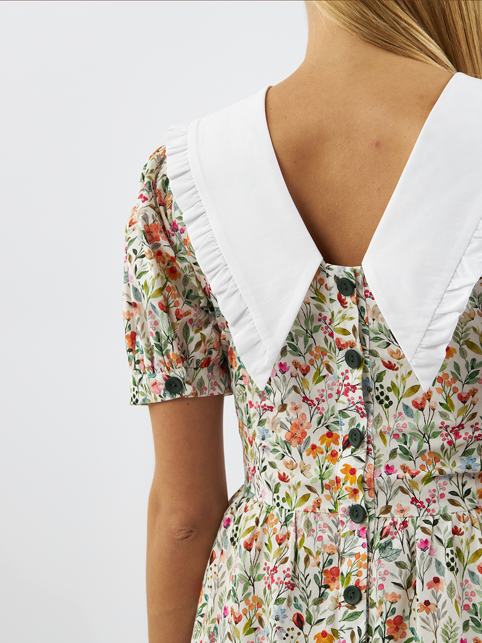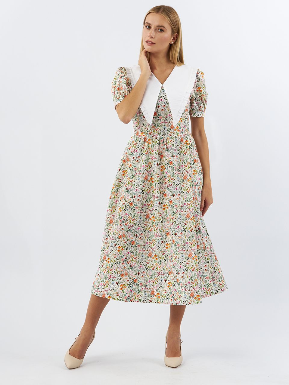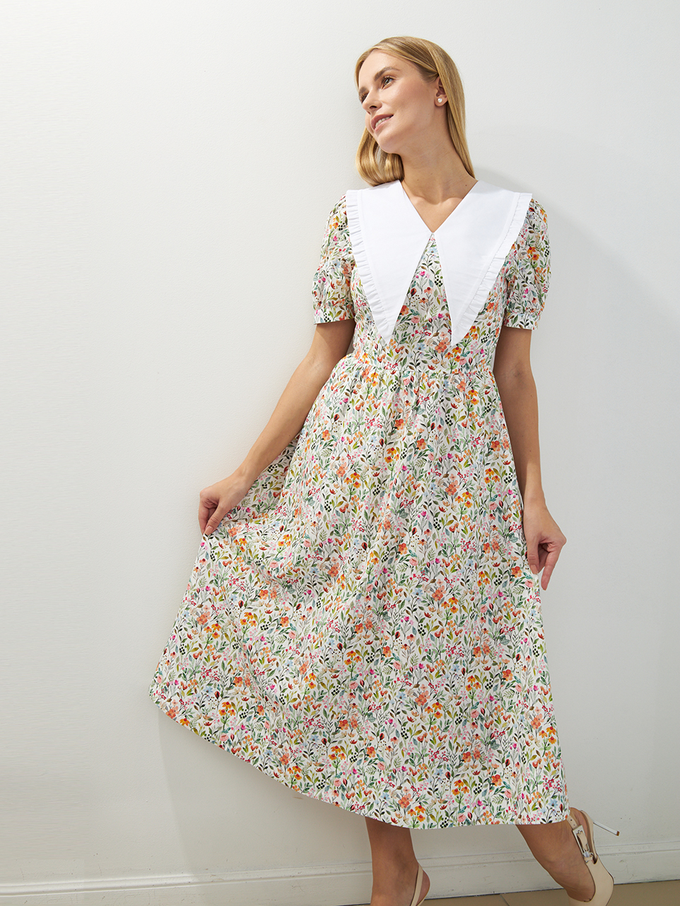 Платье с контрастным белым воротником и декоративными пуговицами – готовый женственный образ для летнего мероприятия или красивых будней. Модель с отрезной расклешённой юбкой, слегка завышенной линией талии и приталенным силуэтом. У платья акцентные рукава. Есть молния в левом боку. Платье выполнено из легкой хлопковой ткани.