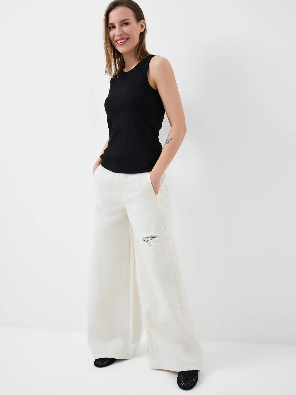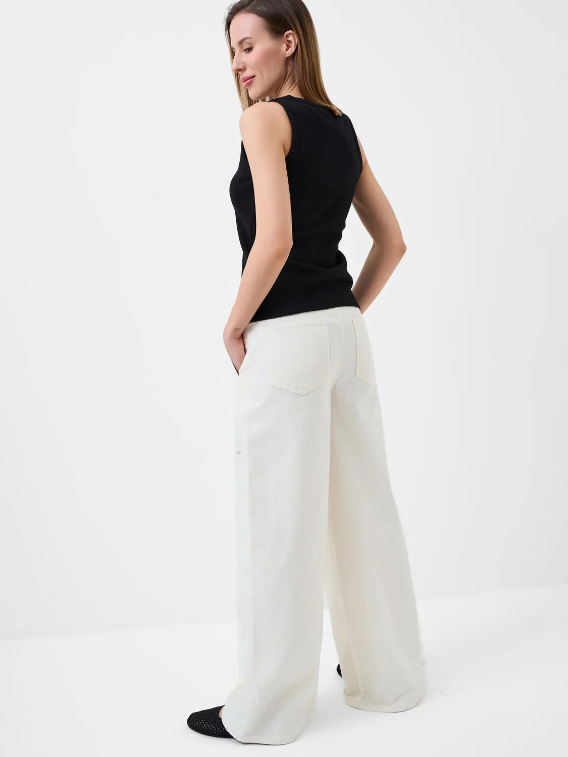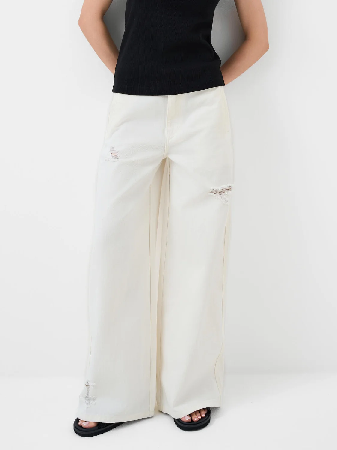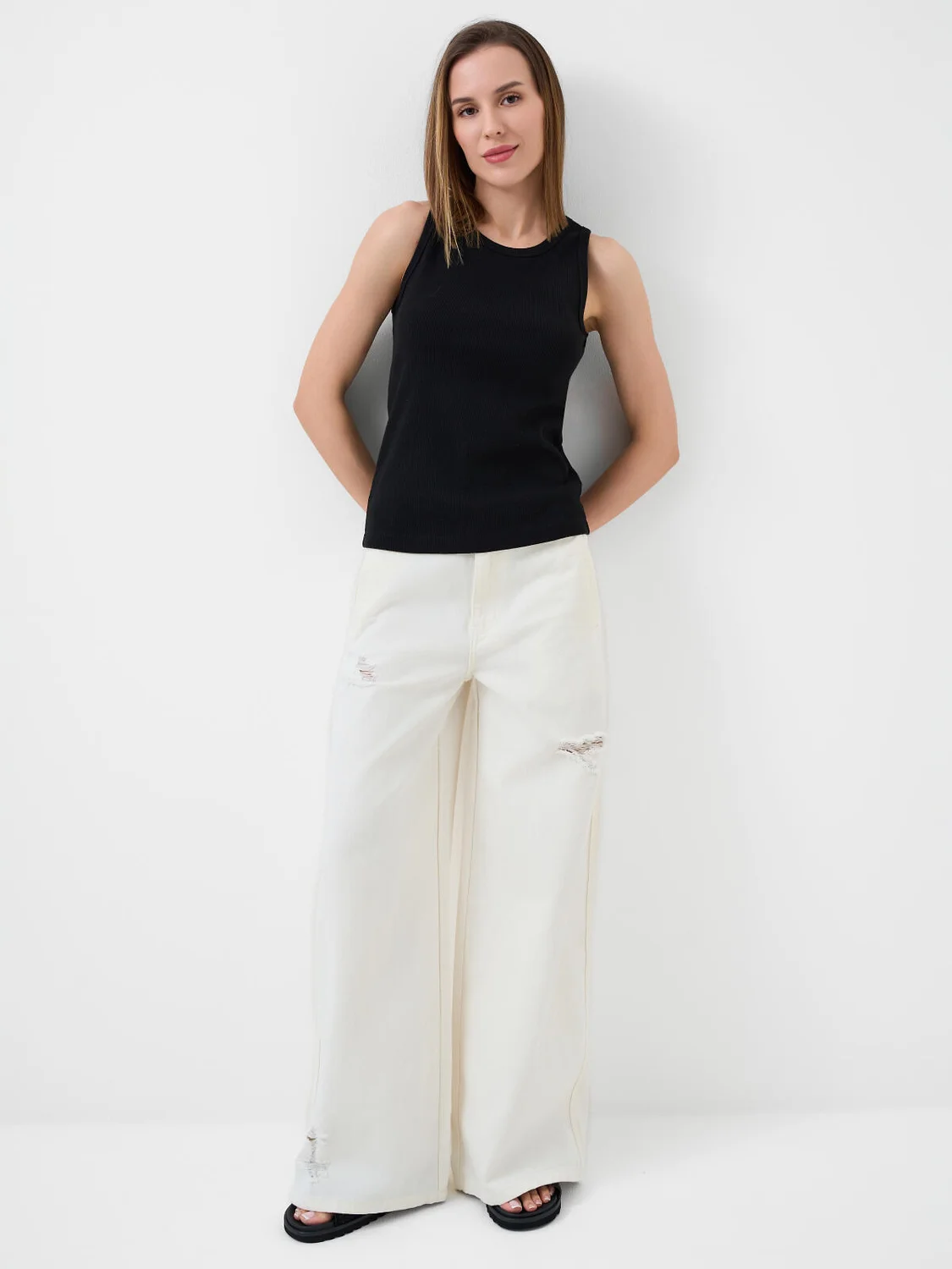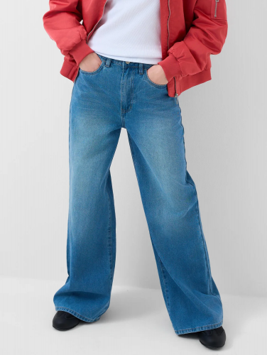 Широкие женские джинсы. Модель wild leg выполнена из светлого денима, с прямыми брюками и средней посадкой. Джинсы застёгиваются на молнию и болт. Пояс на талии дополнен внутренней резинкой, что обеспечивает комфортную посадку. Спереди — удобные боковые карманы, сзади — накладные.