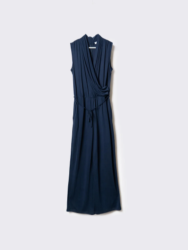 Женский брючный комбинезон. Верхняя часть изделия красиво драпирована, создавая элегантный образ. На талии – эластичная вставка и дополнительный шнур для регулировки объёма. По бокам два удобных кармана. Застёжка – потайная молния на спинке.