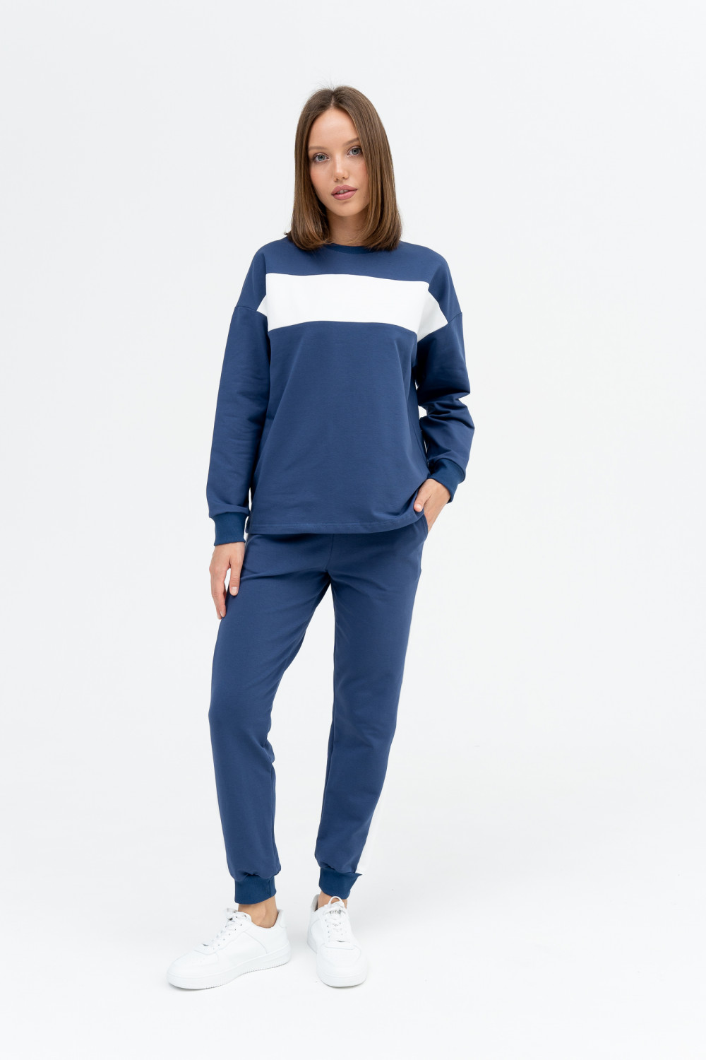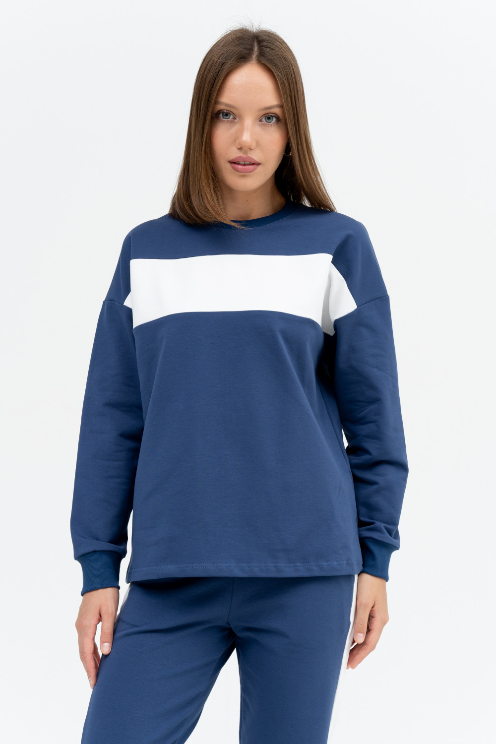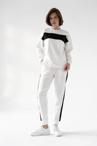 Мягкий уютный костюм из хлопкового футера. Свитшот прямого силуэта со спущенным плечом. Рукава объемные на манжете, горловина круглой формы из контрастного полотна, как на свитере. Брюки имеет широкие манжеты и удобные карманы. Контрастные лампасы на брюках визуально стройнят, а контрастная вставка на свитшоте придает изящества и игривости костюму.