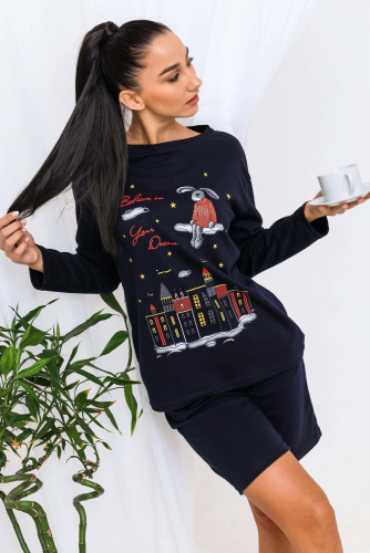 Костюм женский, выполнен из трикотажного полотна кулирка. Костюм состоит из футболки и шорт. Футболка свободного силуэта, горловина окантована, на полочке выполнена печать.