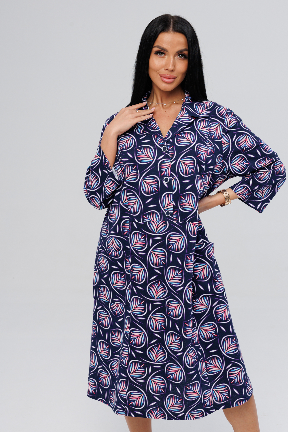 Платье женское из ткани с ярким принтом прямого силуэта, рукав 3/4, выполнено из трикотажного полотна кулика - 100% хлопок. Отрезная кокетка украшена пуговицами и английским воротником. Для практичности дополнено карманами.