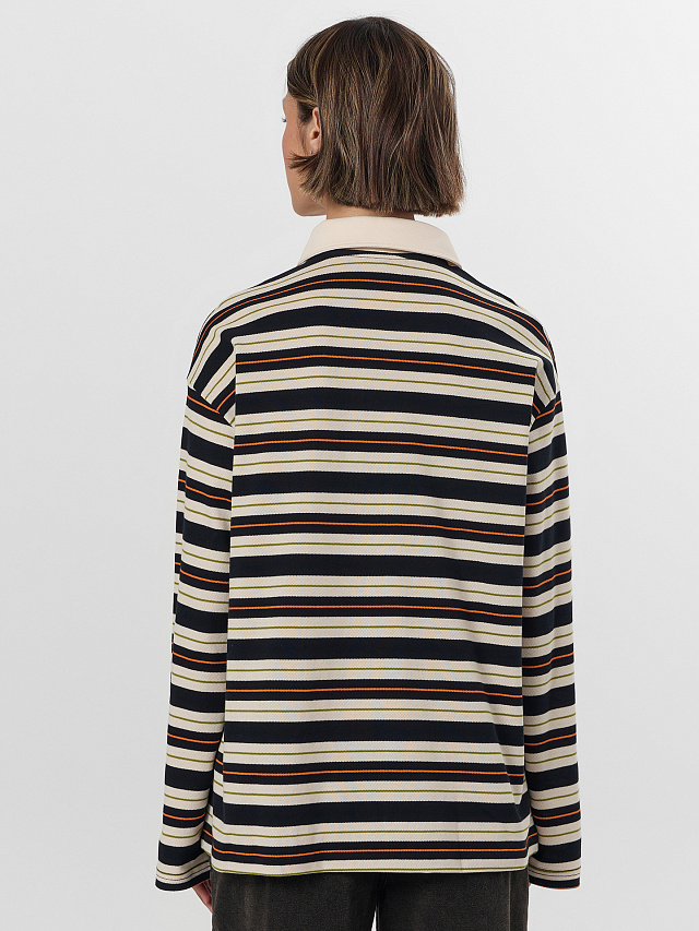 Женское поло с длинным рукавом в полоску создано для повседневной носки. Свободный крой со спущенным плечом не сковывает движения, а классическая застежка на три пуговицы удобна в использовании. Рукава и низ изделия аккуратно подогнуты и прошиты — это предотвращает растягивание ткани и сохраняет форму после стирок.