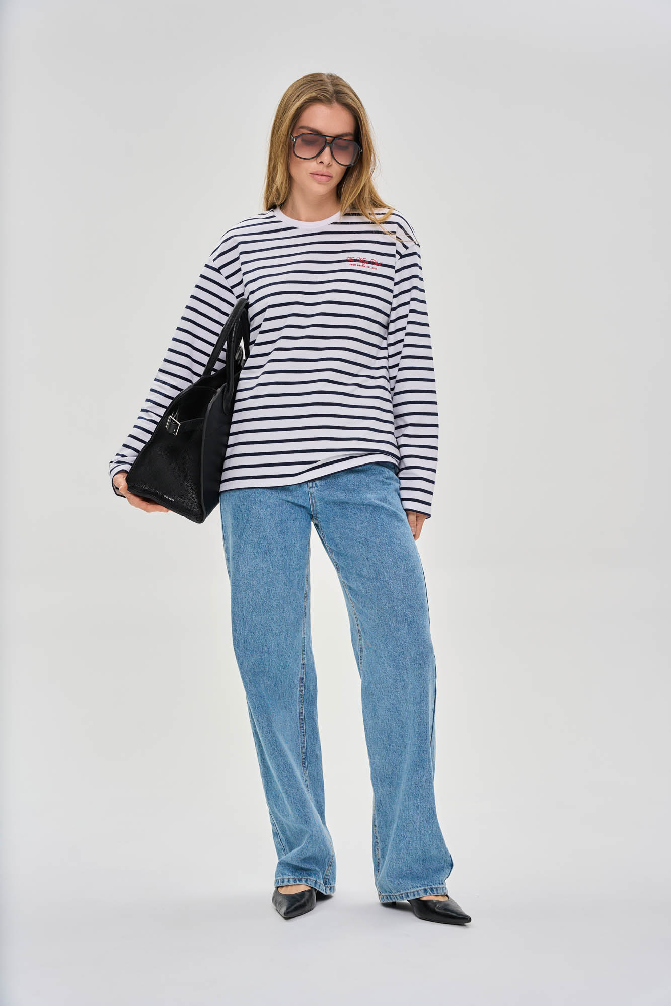 На переде дополнен контрастными текстовым принтом.