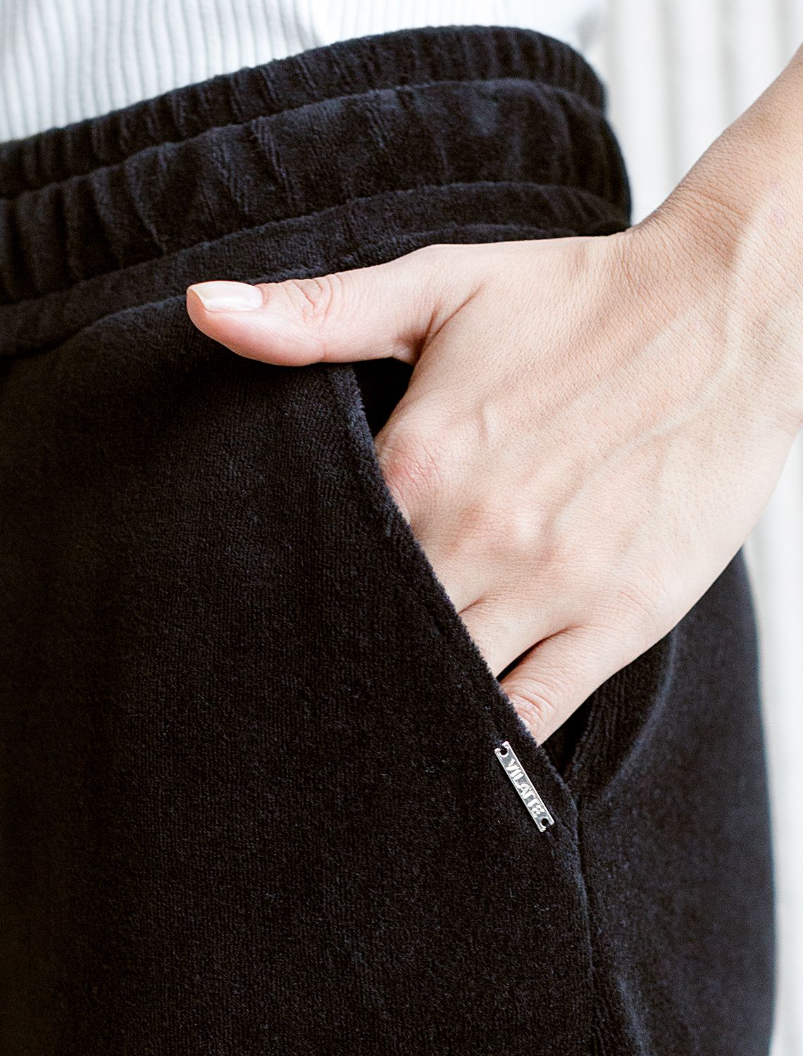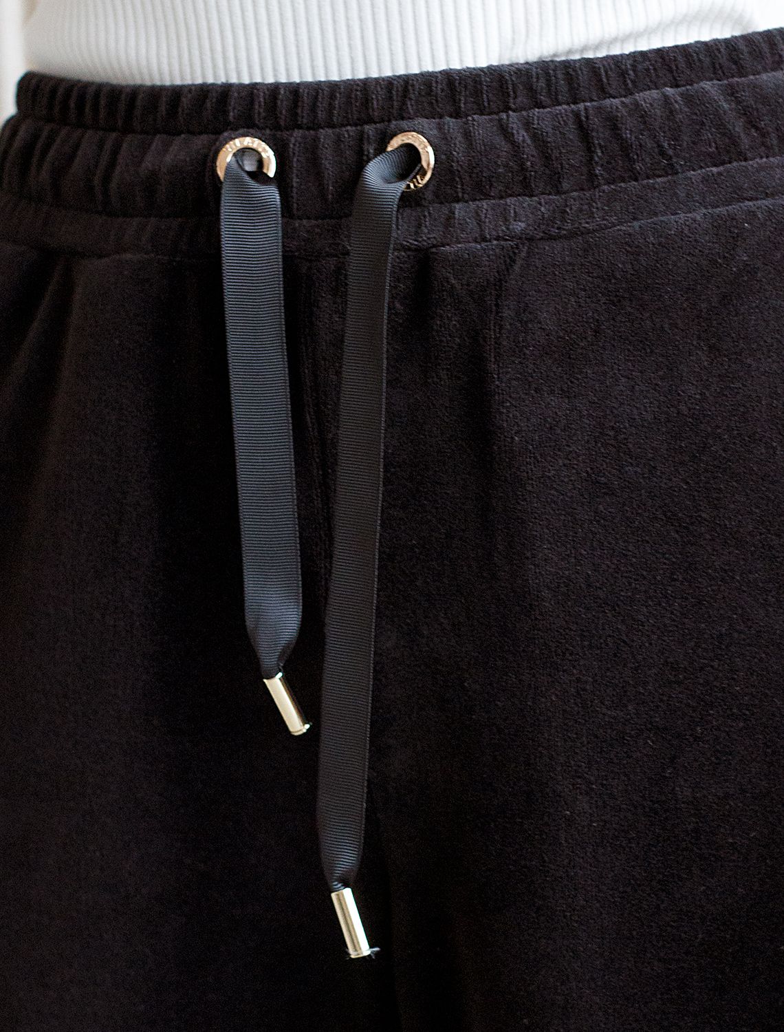Прямые брюки выполнены из велюра. Модель с широким поясом дополнена шнурком из репсовой ленты и серебристой фурнитурой. Легкий и мягкий материал с матовой фактурой придает изделию нежность и комфорт. Хорошо держит тепло и форму – идеальное решение для домашнего отдыха. Сочетается в костюме с худи D49.053