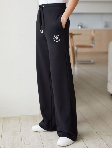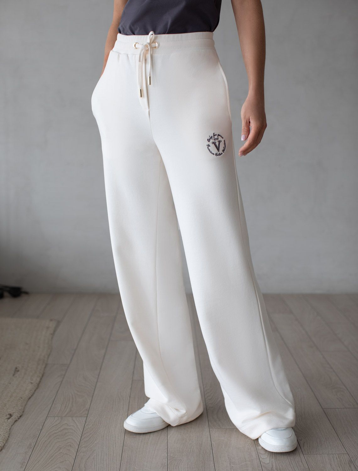 Брюки выполнены из премиального футера трехнитки без начеса. Модель дополнена эластичным поясом на резинке и хлопковым шнурком с золотистой фурнитурой. По бокам два кармана. Наличие эластана в составе гарантирует формоустойчивость и износостойкость изделия. Изделие сочетается в костюме с худи D49.054