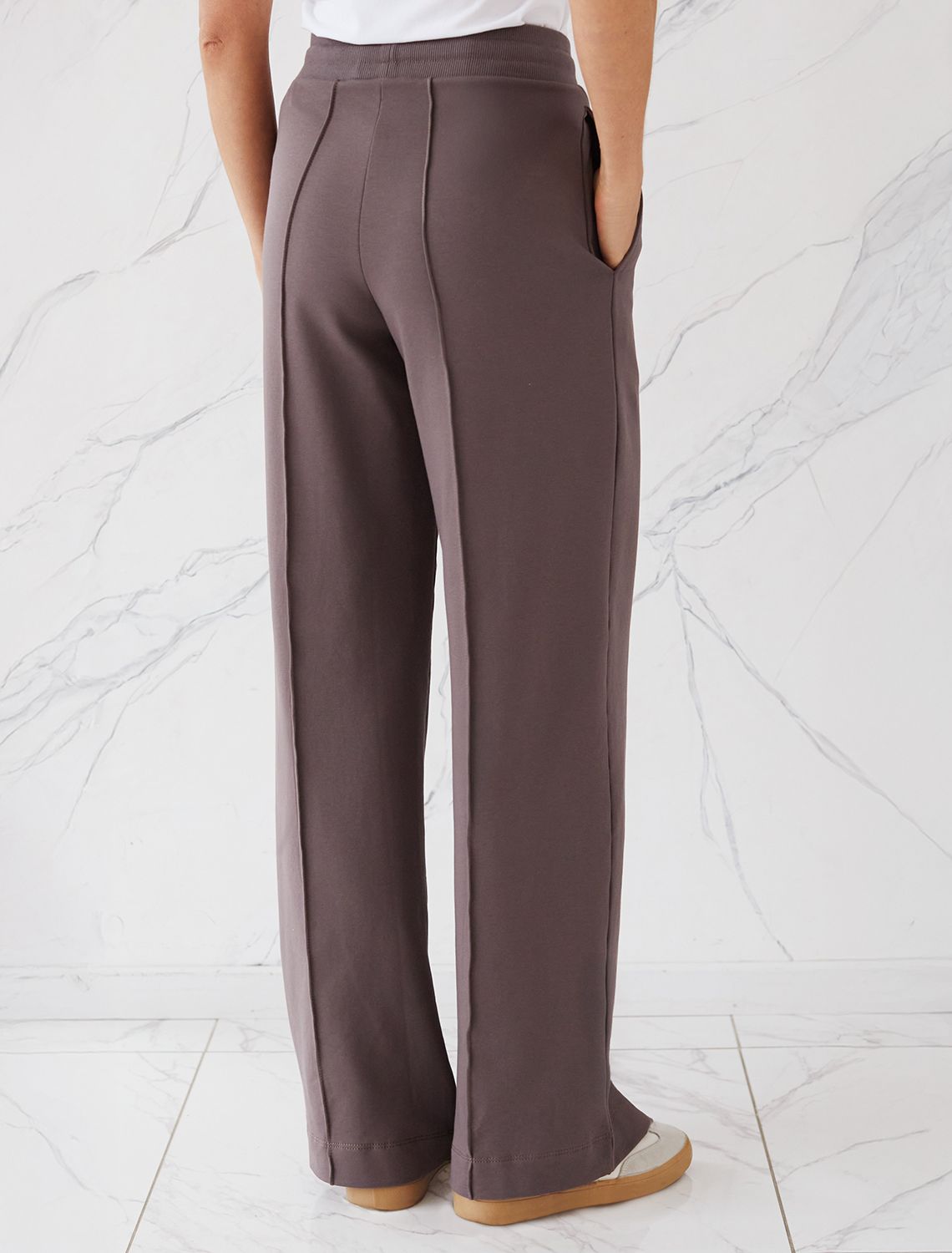 Брюки актуального кофейного цвета прямого кроя выполнены из премиального футера-двухнитки. Лаконичный силуэт поддерживают застроченные стрелки, зрительно вытягивающие силуэт. Удобный пояс на резинке регулируется хлопковым шнурком с золотистой фурнитурой. Наличие эластана в составе изделия гарантирует комфорт и долговечность изделия. Эластичный материал хорошо пропускает воздух, позволяя телу дышать, и легко тянется, не ограничивая движения.