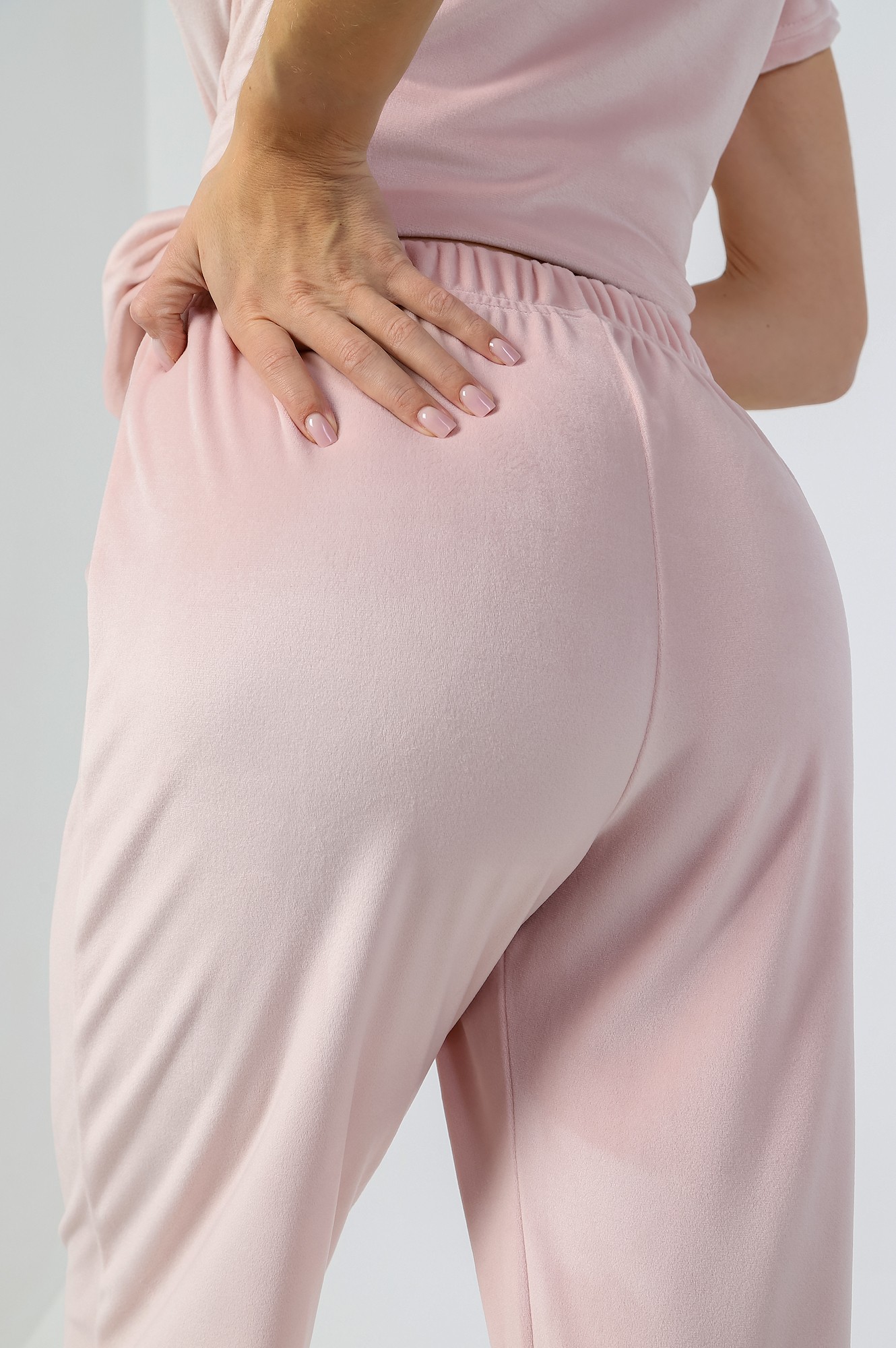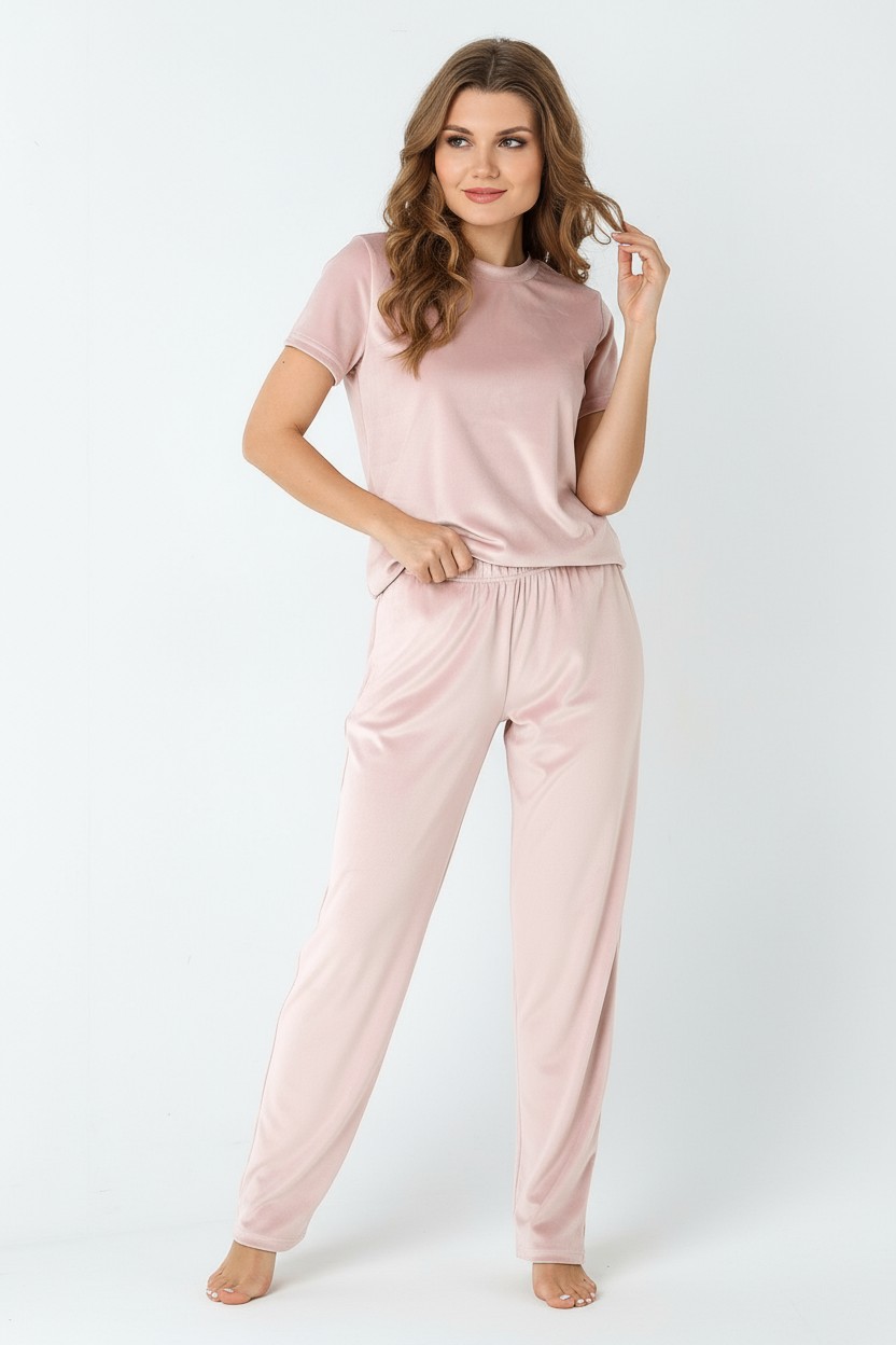 Костюм молодежный из трикотажного полотна «велюр-стрейч», состоящий из футболки и брюк. Футболка - классического покроя, с короткими втачными рукавами и горловиной овальной формы, обработанной втачной бейкой. Брюки – длинные, свободного покроя, с эластичной тесьмой по талии.