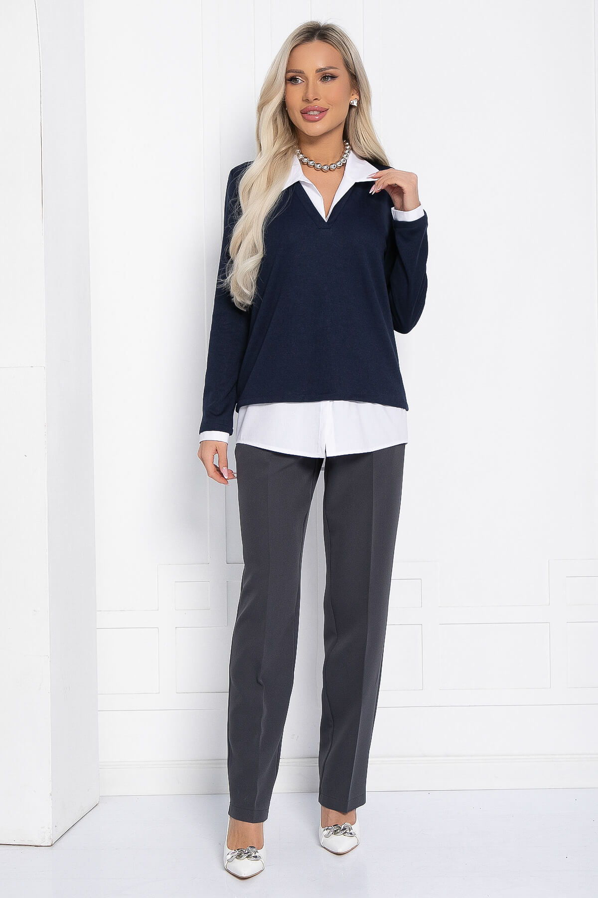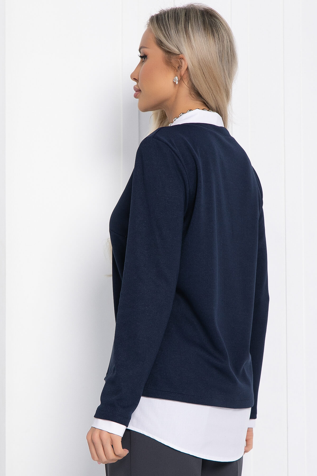 Джемпер из мягкого трикотажа украсит ваш деловой образ и сделает его красивым и комфортным. Сочетание двух видов ткани создаёт эффект многослойного образа. Рукав втачной, длинный. Отлично будет смотреться такой джемпер как с джинсами, так и с любым классическим низом. Воротник, низ изделия и манжеты на рукавах выполнены из хлопка.
