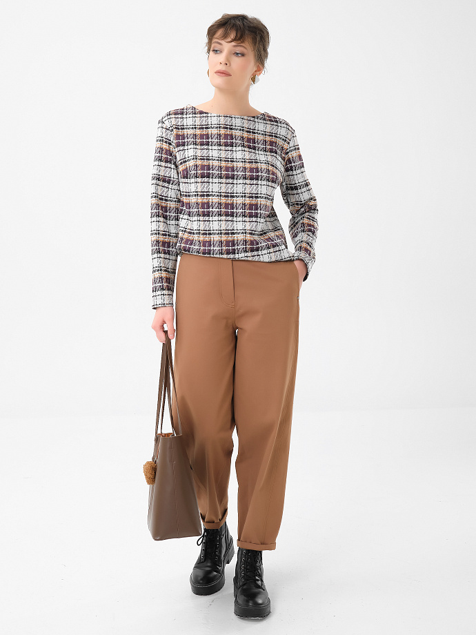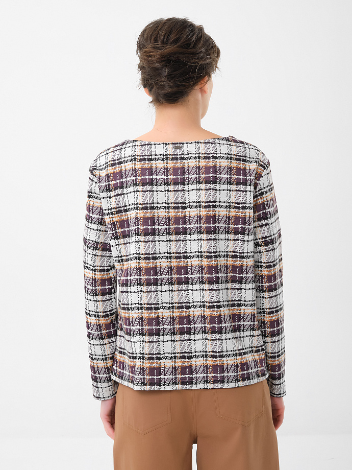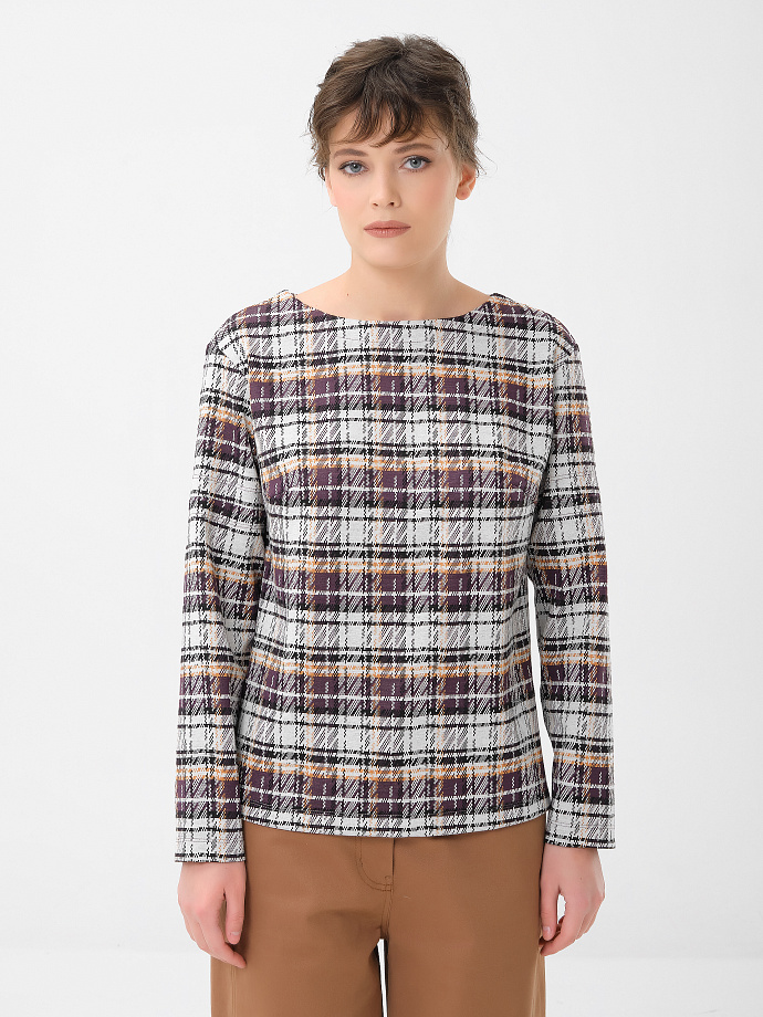 Модель прямого силуэта, со спущенным плечом и длинным рукавом. На рукаве обработан горизонтальный подрез.