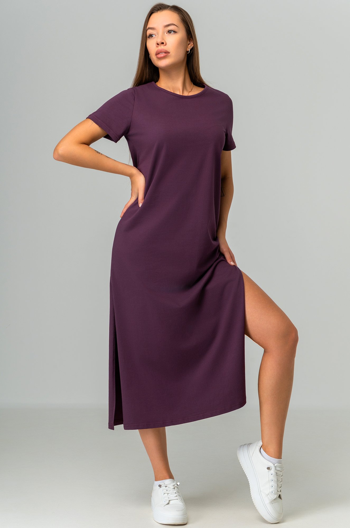 Однотонное пурпурное платье миди подходит для дома. Трикотажное свободное платье подойдет на каждый день.