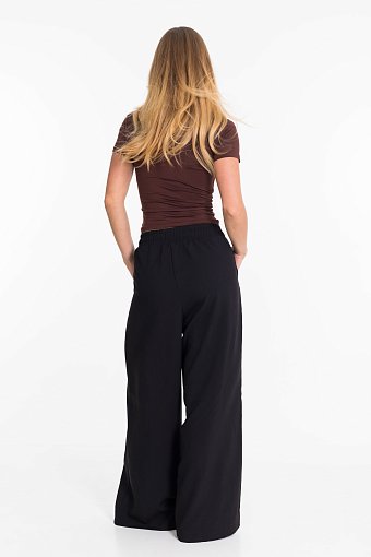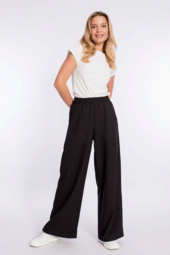 Женские брюки свободного силуэта выполнены из искусственного льна. Спереди настрочены карманы, пояс на резине.