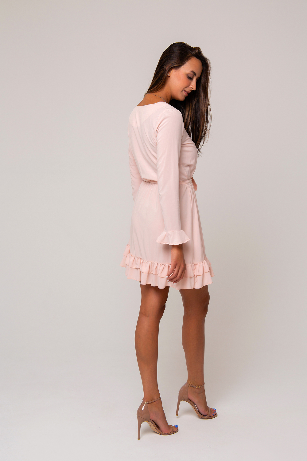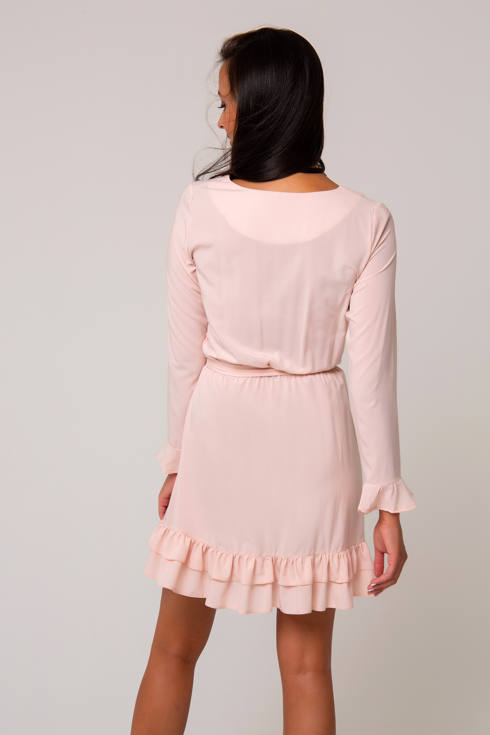 Платье А-силуэта, выполненное в нежном приятном оттенке. Рукав длинный, декорирован воланом, что придает платью женственности и романтичности. Край подола также оформлен воланами, которые еще больше привносят в образ нежности и изыска. Вырез горловины V-образный. Изделие дополнено поясом. Состав: 95% полиэстер, 5% эластан. Длина изделия см. Рост модели на фото 173 см (+ каблук). Цвет: персиковый; Материал: ниагара;ниагара; Состав: 95% п/э+5% эластан.