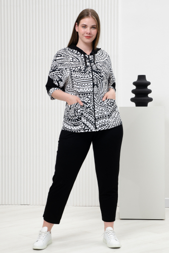 Рукава сорочки декорированы манжетами с кантом, которые органично дополняют образ, придают изделию более завершенный и аккуратный вид. Брюки в полоску имеют прямой крой, что обеспечивает комфортную посадку и подходит практически всем женщинам.
