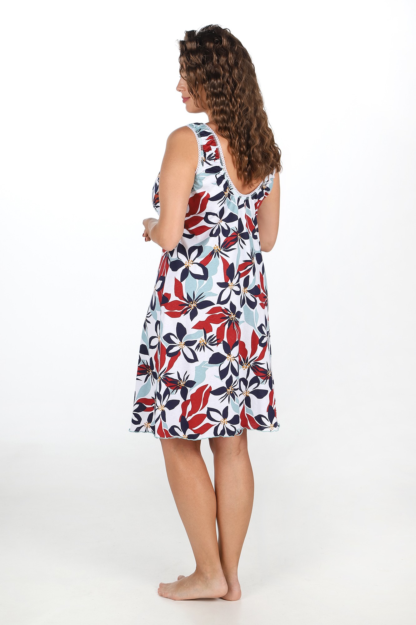 Сорочка женская из трикотажного полотна «кулирка» с набивным рисунком, расширенная книзу, без рукавов, с расширенной, углубленной горловиной овальной формы и притачной кокеткой по переду. Срезы пройм и горловины, а также шов притачивания кокетки, обработаны фасонной эластичной тесьмой с кружевным краем. Низ изделия обработан узкой обметочной строчкой.