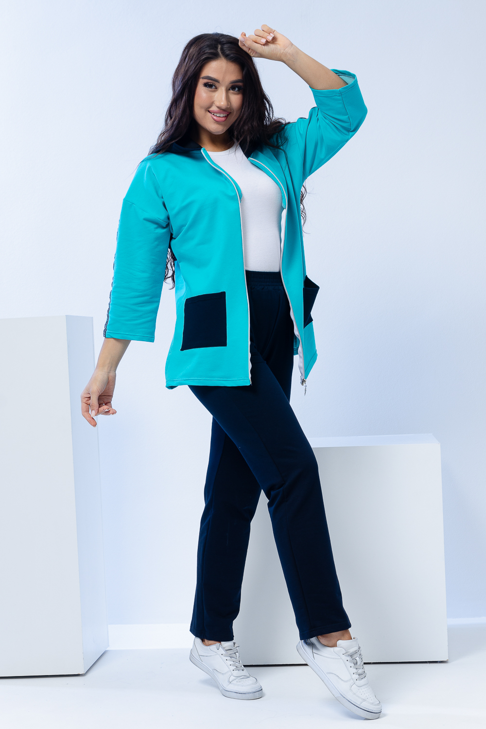Костюм женский с брюками выполнен из ткани футер 2-нитка качества пенье. Кофта с капюшоном, на серебристой молнии, с двумя накладными карманами, спущенный рукав 3/4. На рукавах пришита декоративная тесьма с люрексом. Брюки на поясе с карманами. Костюм идеально подойдет для прогулок, спорта и отдыха.