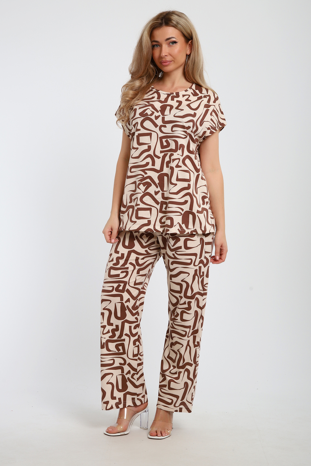 Костюм женский выполнен из кулирки 100% хлопок, состоит из футболки со спущенным плечом и брюк. Брюки свободного кроя на поясе, горловина футболки обработана узким кантом. Костюм очень комфортный, удобный, идеально подойдет как для прогулок, так и для дома и отдыха.