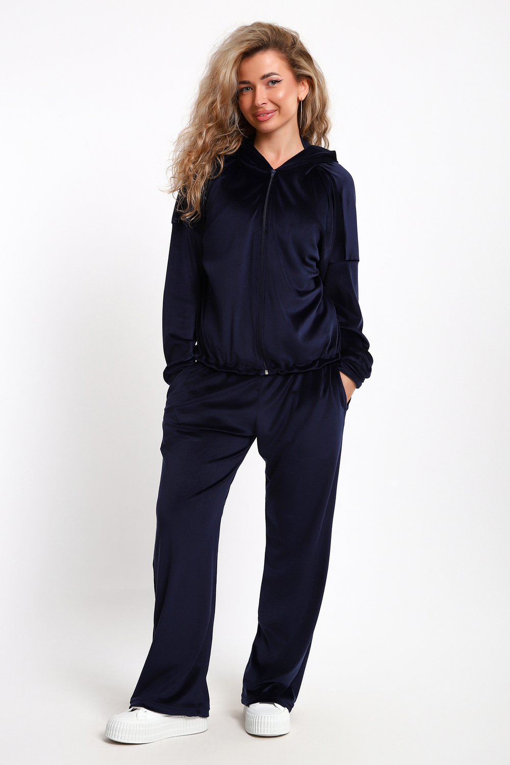 Костюм женский велюровый состоит из толстовки на молнии и брюк. Толстовка с глубоким капюшоном, по низу утягивающий шнур с фиксаторами, рукав спущенный с манжетом, брюки прямые с карманами. Костюм мягкий, удобный, отлично подойдет для дома, прогулок и отдыха.