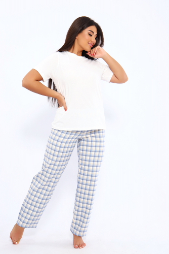 Костюм женский домашний с шортами в пижамном стиле выполнен из хлопка. Футболка из плотного трикотажа, шорты из мягкой фланели, по бокам карманы. Костюм идеально подойдет для дома и сна.