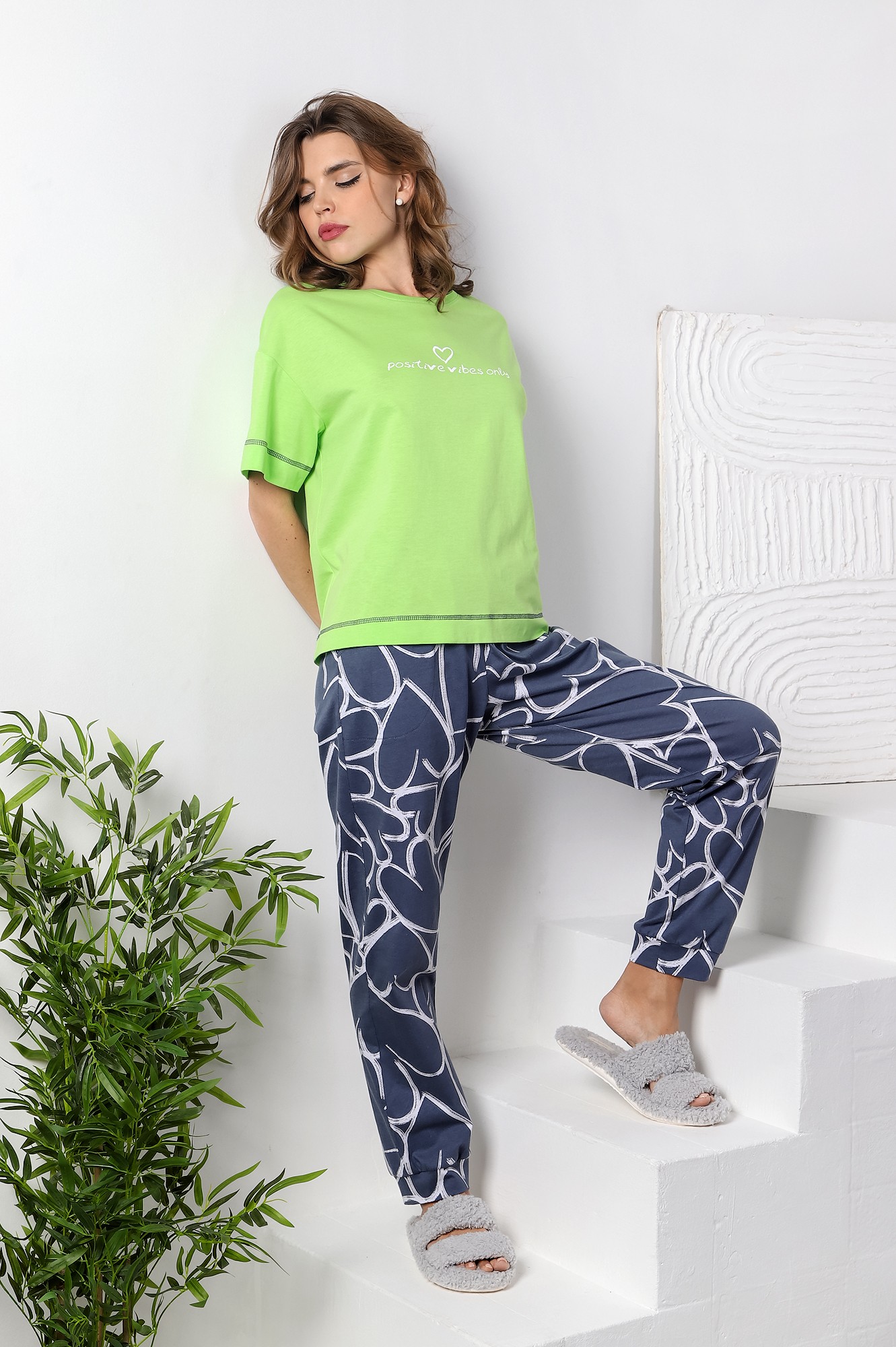 ниточной строчкой контрастными нитками.Брюки - из полотна с набивным рисунком, длинные, свободные, с карманами в боковых