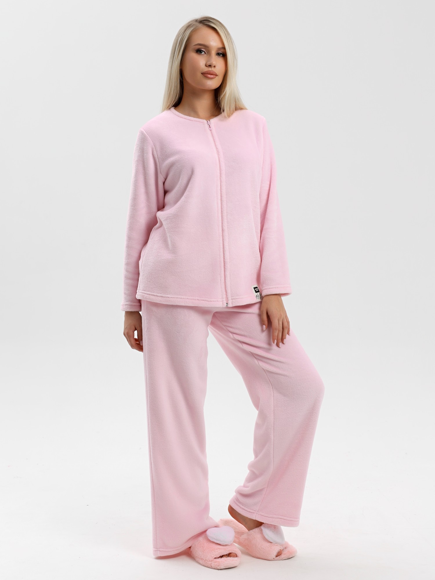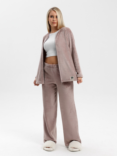 Костюм молодежный из гладкокрашенного тканого полотна «велсофт», состоящий из куртки и брюк. Куртка - прямого силуэта, с длинными втачными рукавами, без воротника с горловиной овальной формы, центральной бортовой застежкой на тесьму «молния». На левой полочке на подгибке, настрочен декоративный элемент.Брюки – длинные, свободные, с карманами в боковых швах и с эластичной тесьмой по талии.