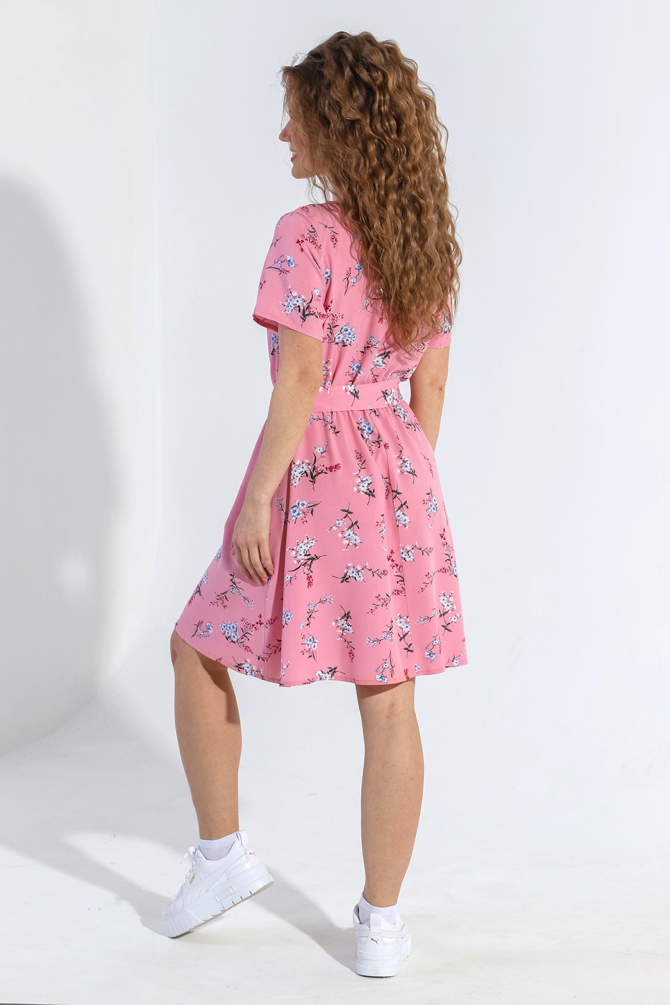 Платье молодежное из тканого штапельного полотна с набивным цветочным рисунком, отрезное по талии, с расклешенной юбкой, собранной по талии с помощью эластичной тесьмы и короткими втачными рукавами. Полочки лифа образуют запах и V-образную конфигурацию выреза горловины. Бортовые срезы и горловина окантованы основным материалом.