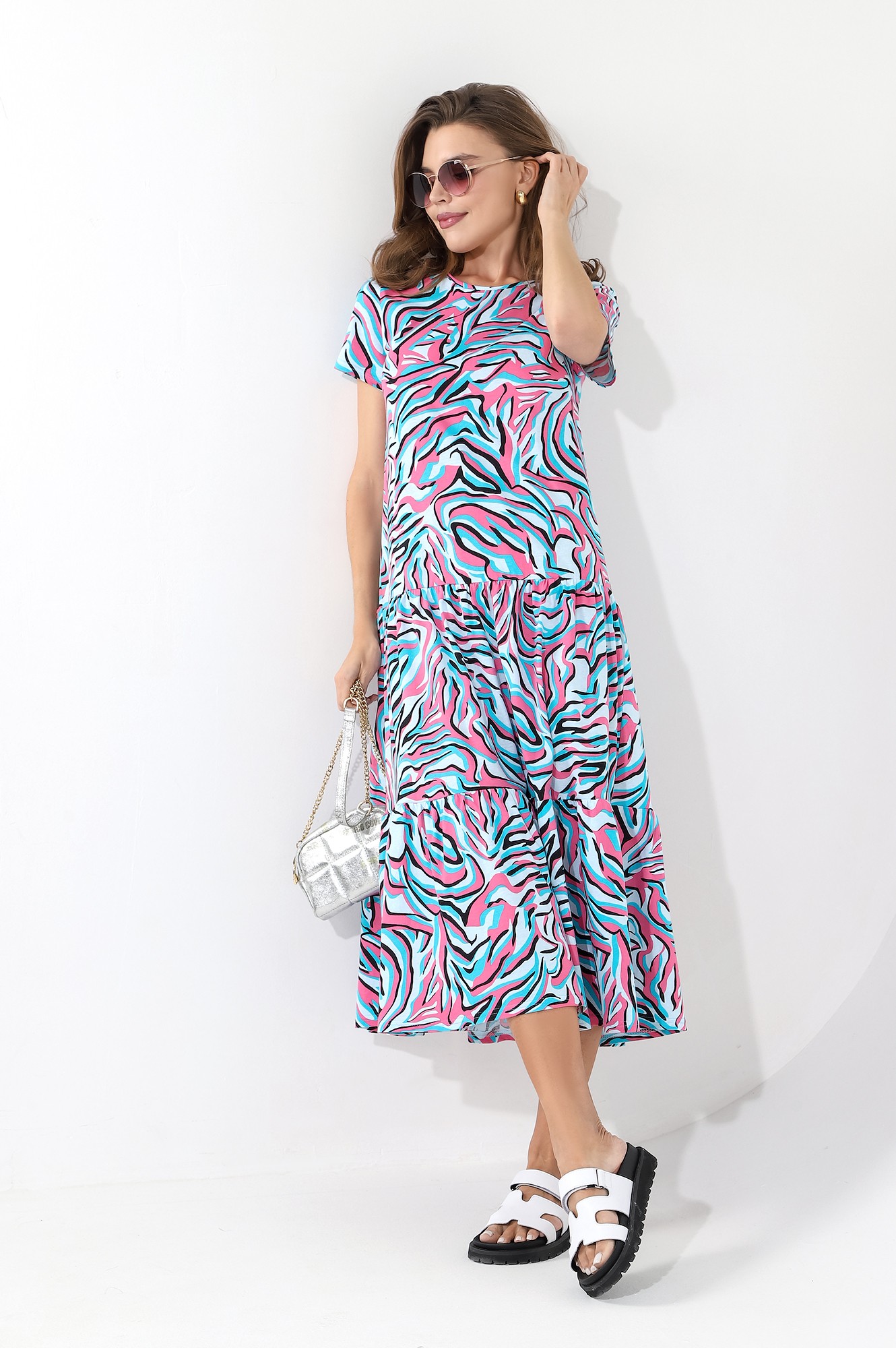 Платье из трикотажного полотна «кулирка» с набивным рисунком, с короткими втачными рукавами, горловиной фигурной формы (сзади V- образная, спереди – овальная), с двумя завязывающимися концам, являющимися продолжением окантовки горловины переда. Юбка – широкая отрезная по линии бедер из двух ярусов, верхний срез присборен.