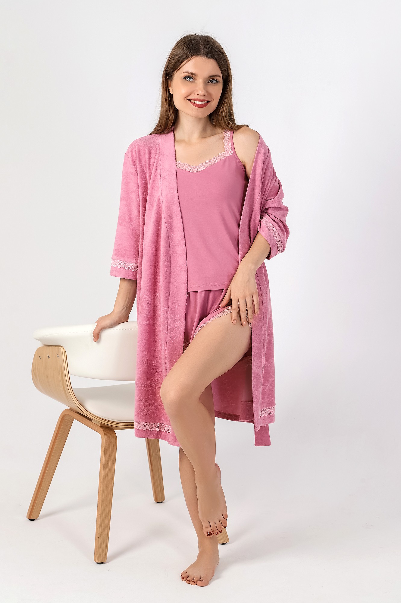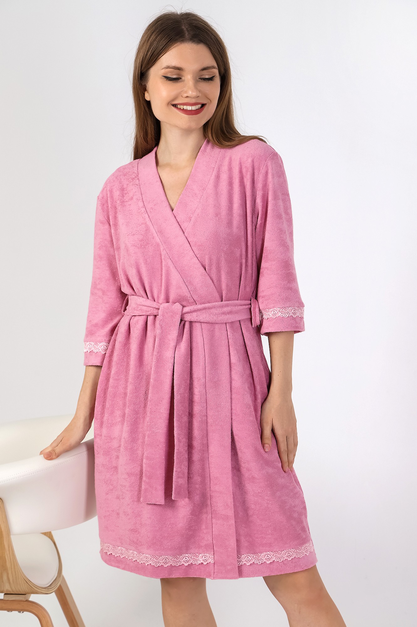 Халат молодежный из гладкокрашеного трикотажного махрового полотна, прямого силуэта, на запахе, с рукавами длиной ¾, карманами в боковых швах и съемным поясом, завязывающимся на талии и продетым в две шлевки, вставленные в боковые швы. Рукава и низ изделия отделаны кружевом. Борта и горловина обработаны притачной планкой.