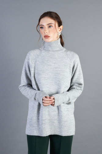 Джемпер свободного силуэта с узором «сердце» в области груди. Низ изделия асимметричной длины (спинка удлинена относительно переда). Длинный рукав-реглан. Круглый вырез горловины, низ изделия и низ рукава оформлены резинкой. Изделие выполнено из мягкой меланжевой пряжи.