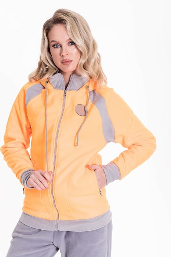 Толстовка выполнена из флиса с отделочными вставками контрастного цвета. Покрой свободный, рукава реглан. Спереди застёжка на молнию. Через люверсы капюшона проложен шнур. По бокам размещены карманы на молнии. С левой стороны вышивка.