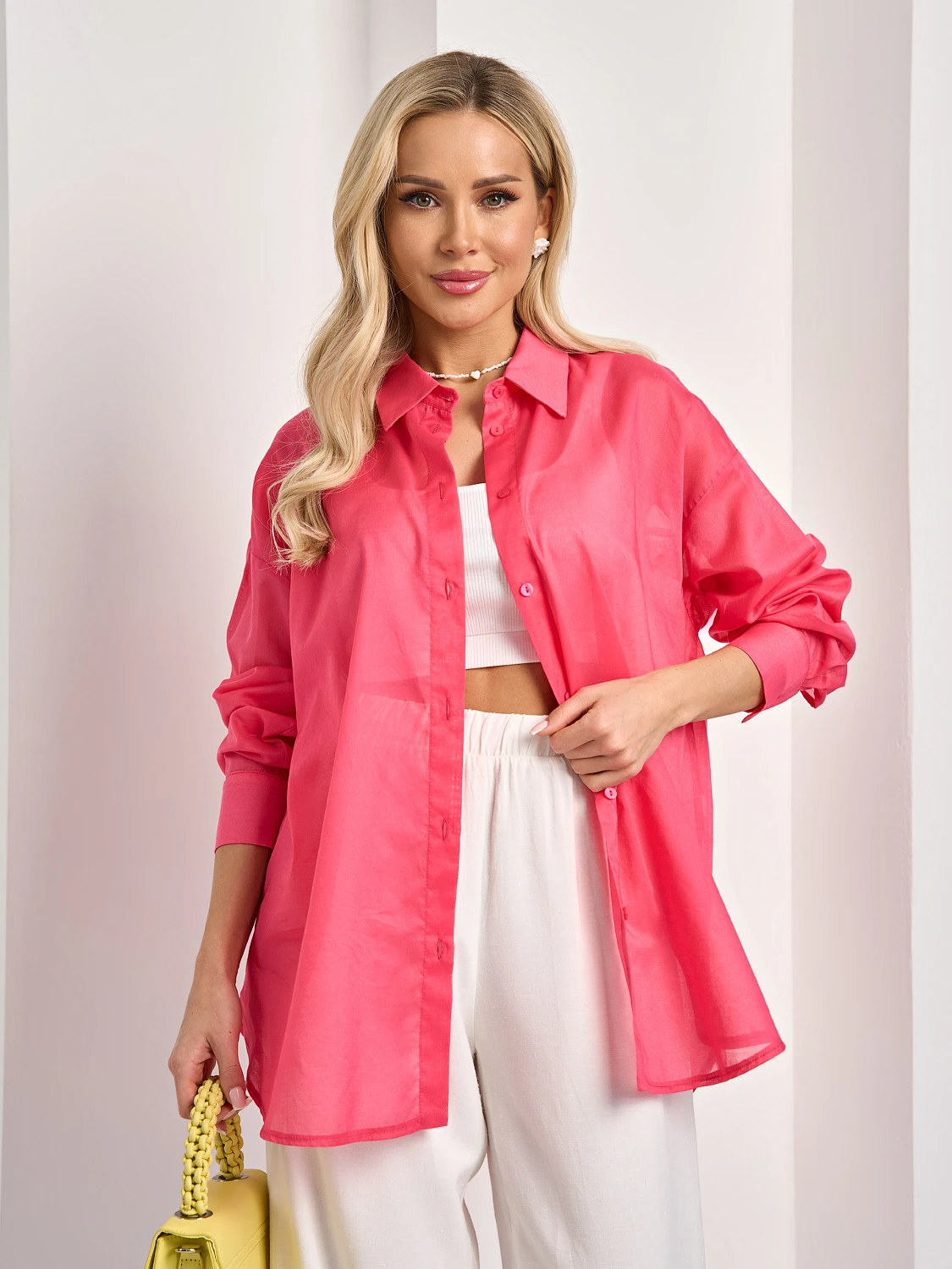 Рубашка свободного кроя со спущенным плечом.