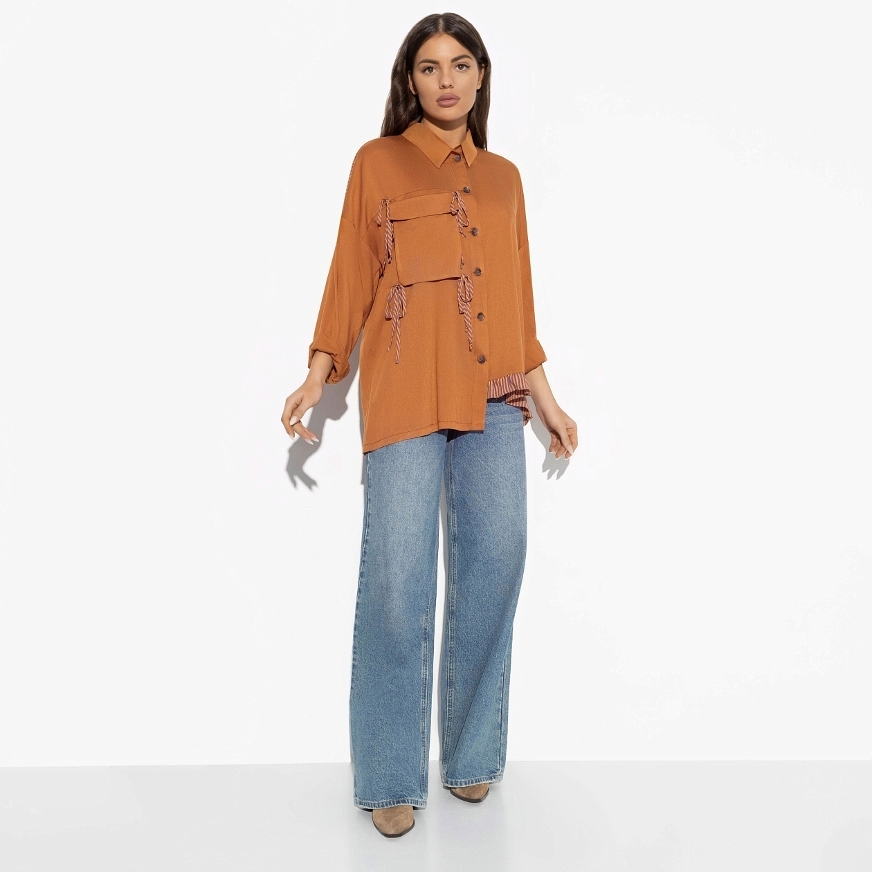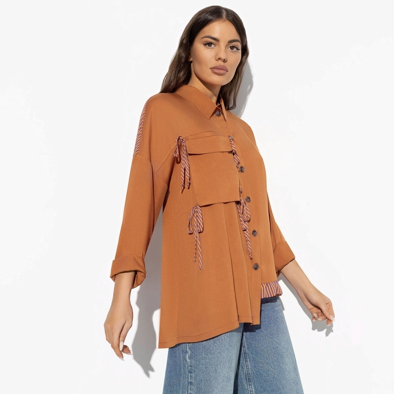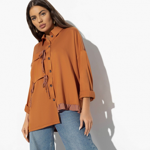Принимай внезапное приглашение на кофе. Только накинь сверху рубашку ЧАРУТТИ. Благородный медный цвет, детали и расслабленный стиль придадут нужную атмосферу и следующий кофе будет уже в более романтичной обстановке. Рубашка из вискозы в комбинации тканей. Объемный акцентный карман, классический ворот. Асимметричный крой подола и рюша по одной стороне рубашки. Акцентная ткань в полоску на линии плеч сзади.