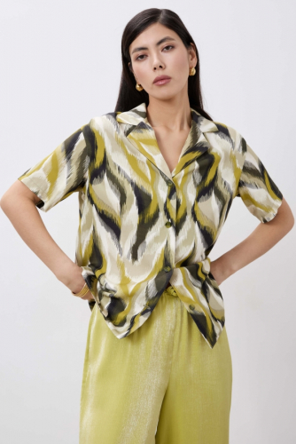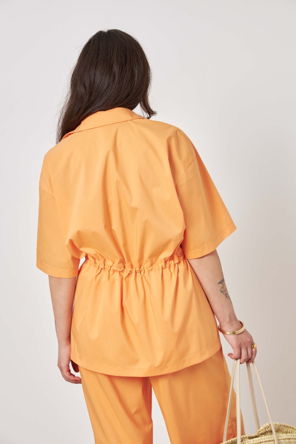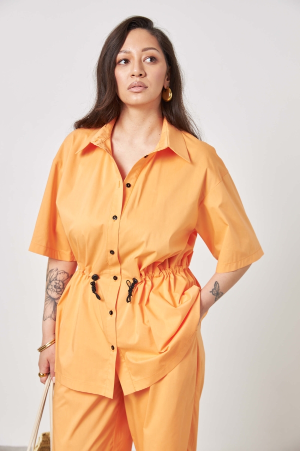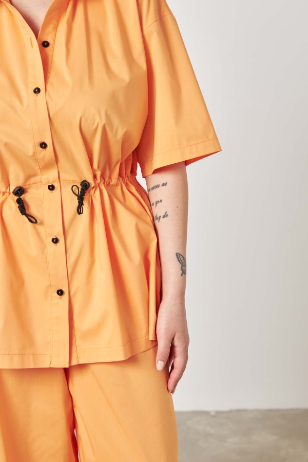 Рубаха свободная с отложным воротником, застегивается на контрастные пуговицы. По линии талии кулиска с резинкой и фиксаторами. Линия плеча занижена, рукава длиной 3/4.