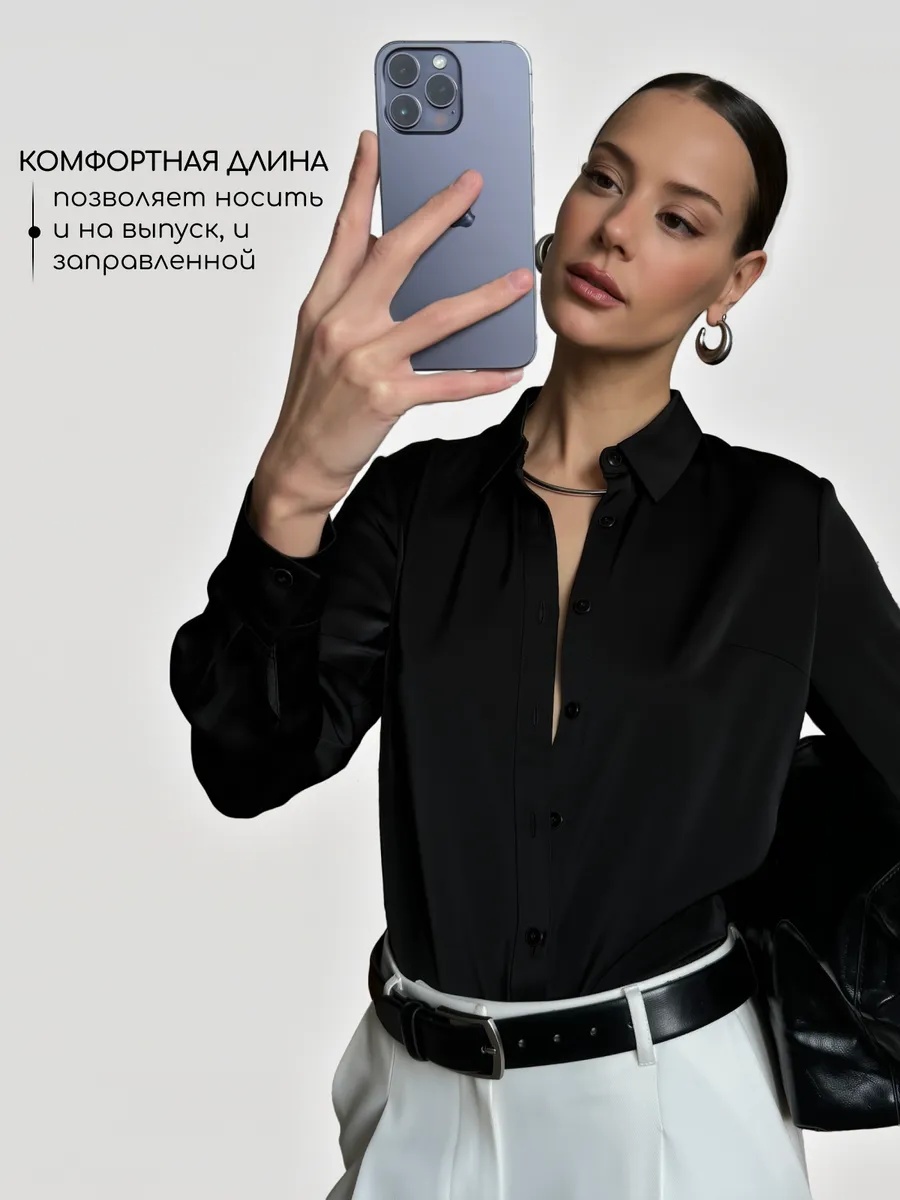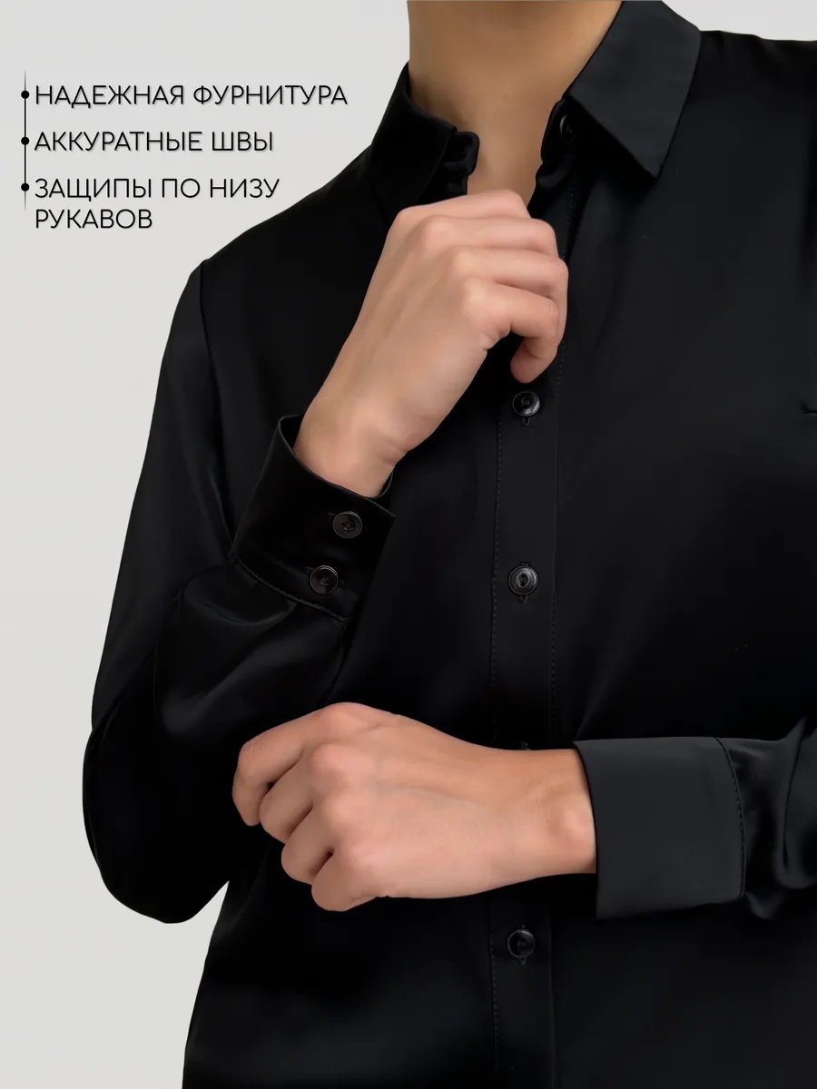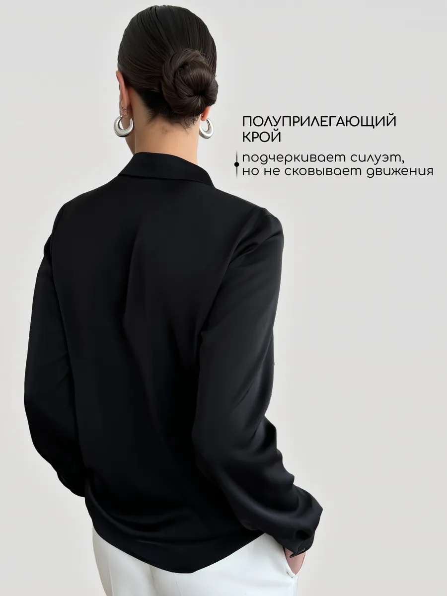 Черная шелковая рубашка — элегантная классика в стиле олд мани с благородным атласным блеском. Модель с отложным воротником и длинным рукавом подходит для офиса, деловых встреч и вечерних образов. Универсальна: легко сочетается с пиджаком, юбкой или брюками. Шелк придает образу утонченность и ощущение роскоши. Базовая вещь, актуальная в любом гардеробе. Важно: при пошиве используется портновская ручка, следы которой исчезают после стирки или обработки паром.