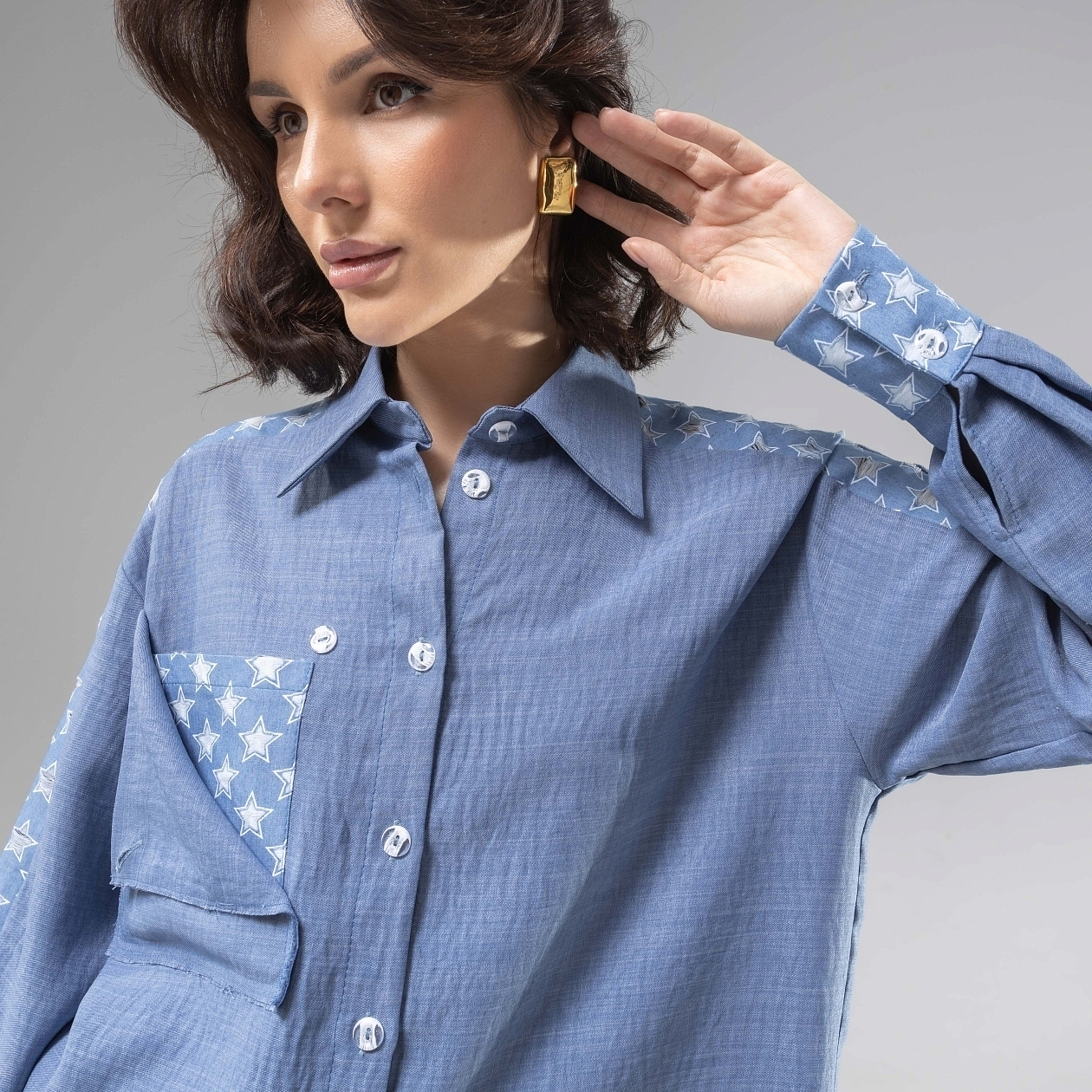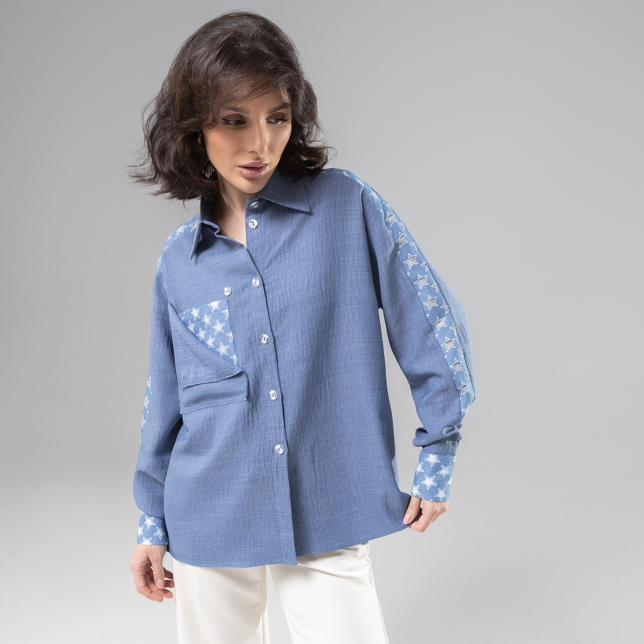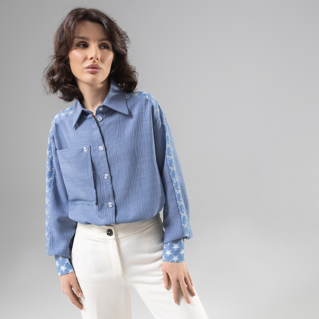 Встречайте рубашку дизайнерскую «Богиня стиля» – воплощение безупречного стиля, комфорта и элегантности. Эта рубашка женская станет настоящей находкой для тех, кто ценит высокое качество и оригинальность в каждой детали. Изготовленная из плательной ткани «Лерисс» и «Джинс перфорация», она предлагает уникальный перфорированный принт, который придаёт изделию нотку экстравагантности. Изящная прямого кроя, рубашка отлично сидит на любой фигуре и подчеркивает женственность её обладательницы. Благодаря акцентным деталям и съемному карману на пуговице, этот модный пазл заслуживает вашего внимания, особенно если вы планируете покупку оптом.