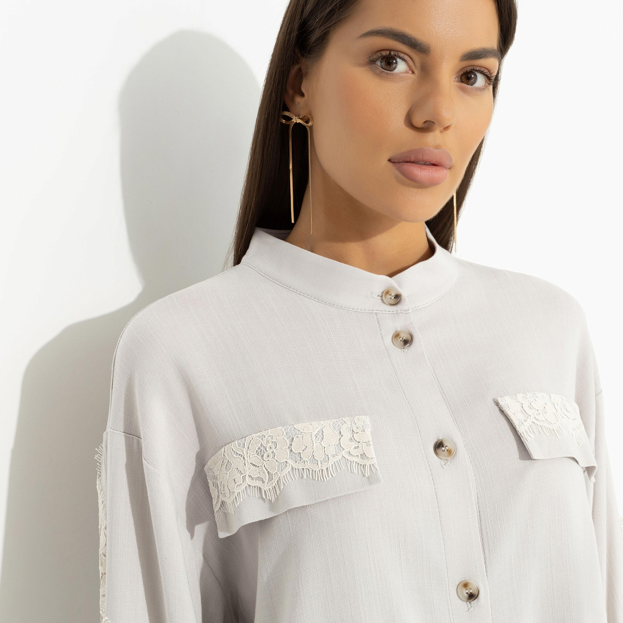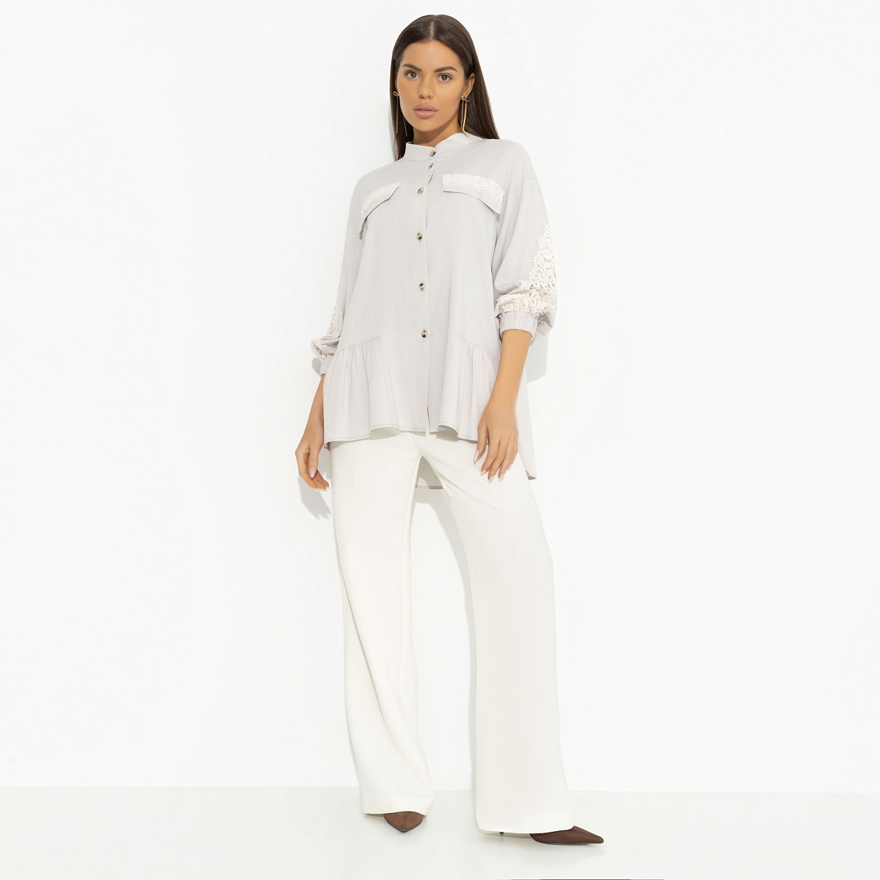 В начале дня важно расставить акценты правильно – зарядка вместо зависания в телефоне, травяной чай вместо кофе и рубашка CHARUTTI вместо всего остального. В ней есть всё – нужный крой, привлекающие внимание детали и нежный цвет. Рубашка свободного силуэта. Рукава и спинка оформлены тонким кружевом. Манжеты оформлены широкой резинкой. Имитация карманов по передней части изделия. Рубашка застегивается на пуговицы.