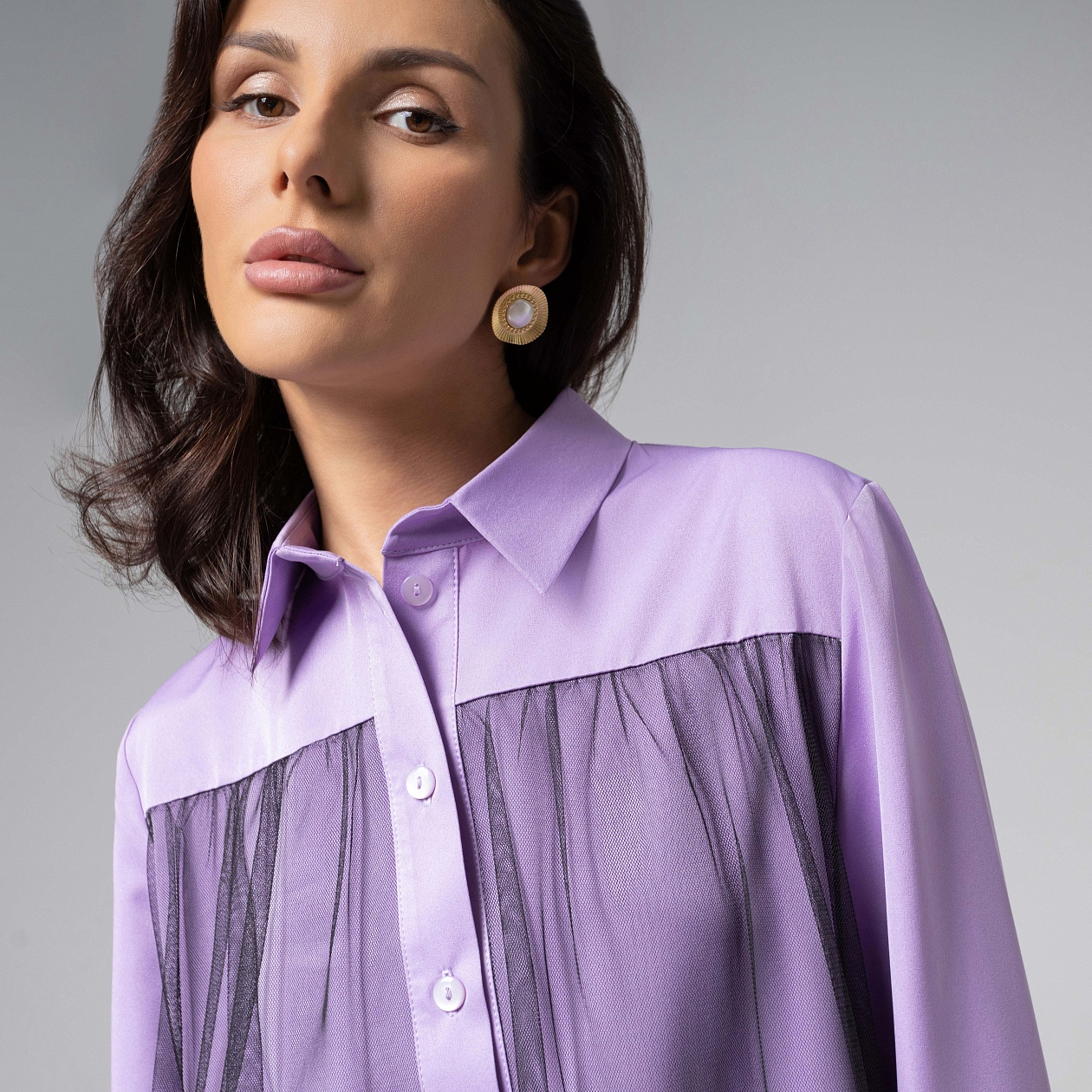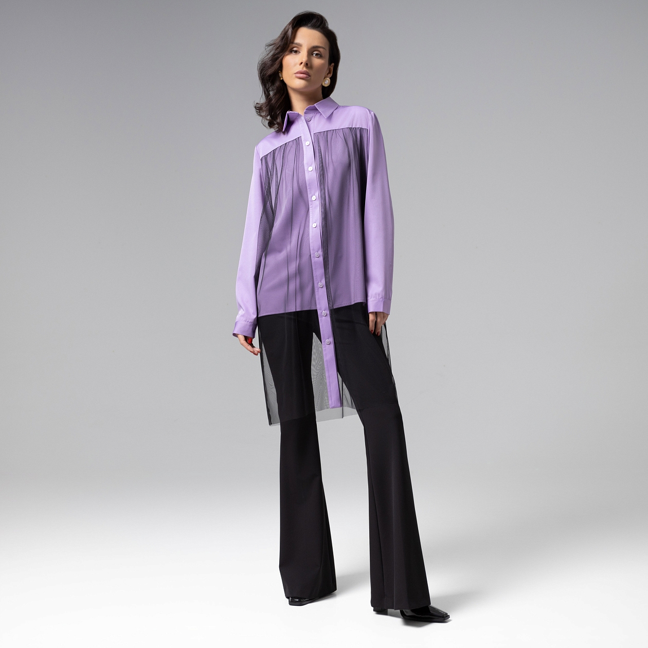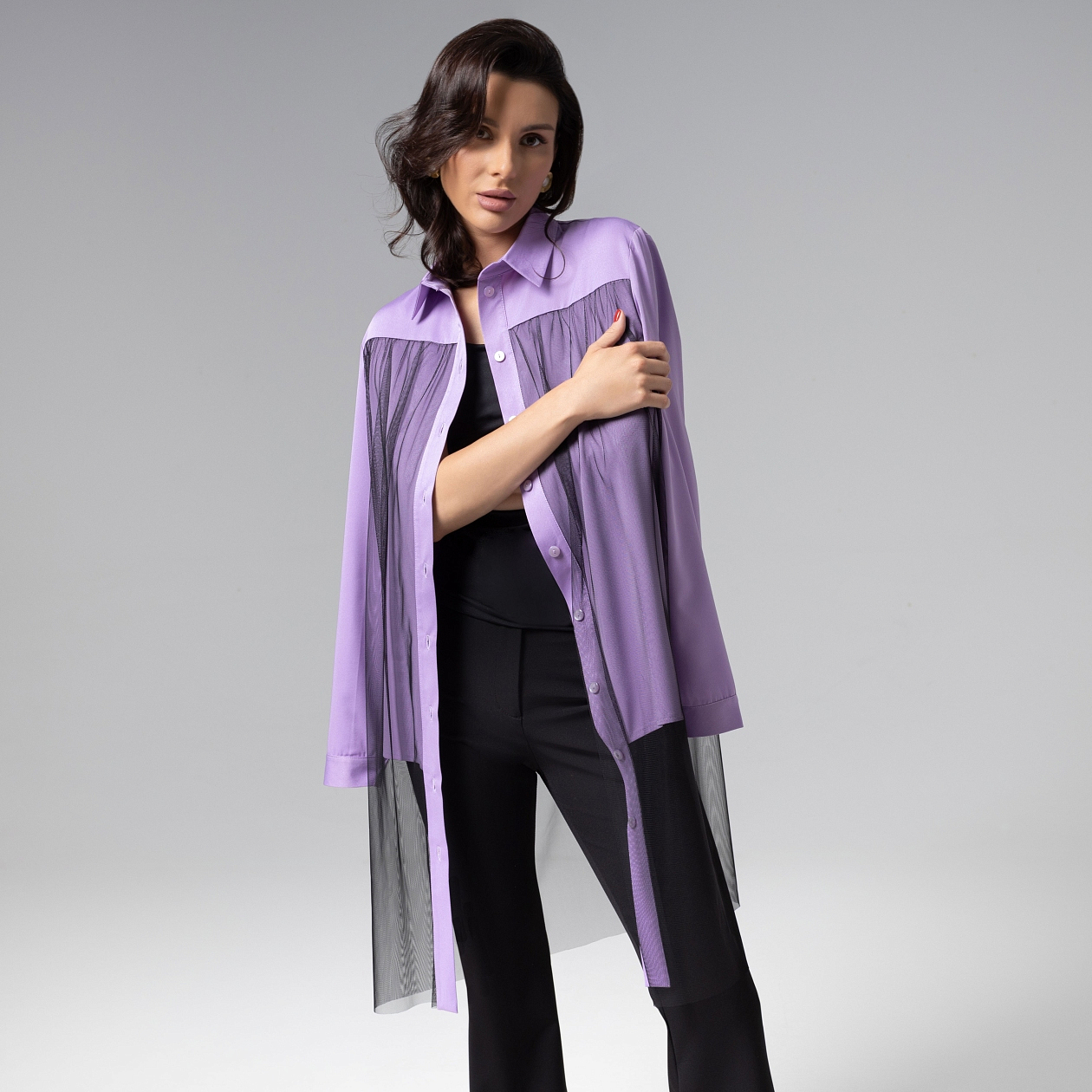 Изысканная модель рубашки ЧАРУТТИ из коллекции PREMIUM выполнена из двух слоев. Нижний – из мягкой вискозы сиреневого оттенка, верхний – из струящейся сетки, создающей эффект дымчатой вуали. Крой с переменной длиной подчеркивает динамику движения. Классический силуэт рубашки добавляет образу скульптурную выразительность. Сетка сохраняет струящуюся форму, контрастируя с плотным нижним слоем. Авангардный фасон превращают классическую рубашку в арт-объект.